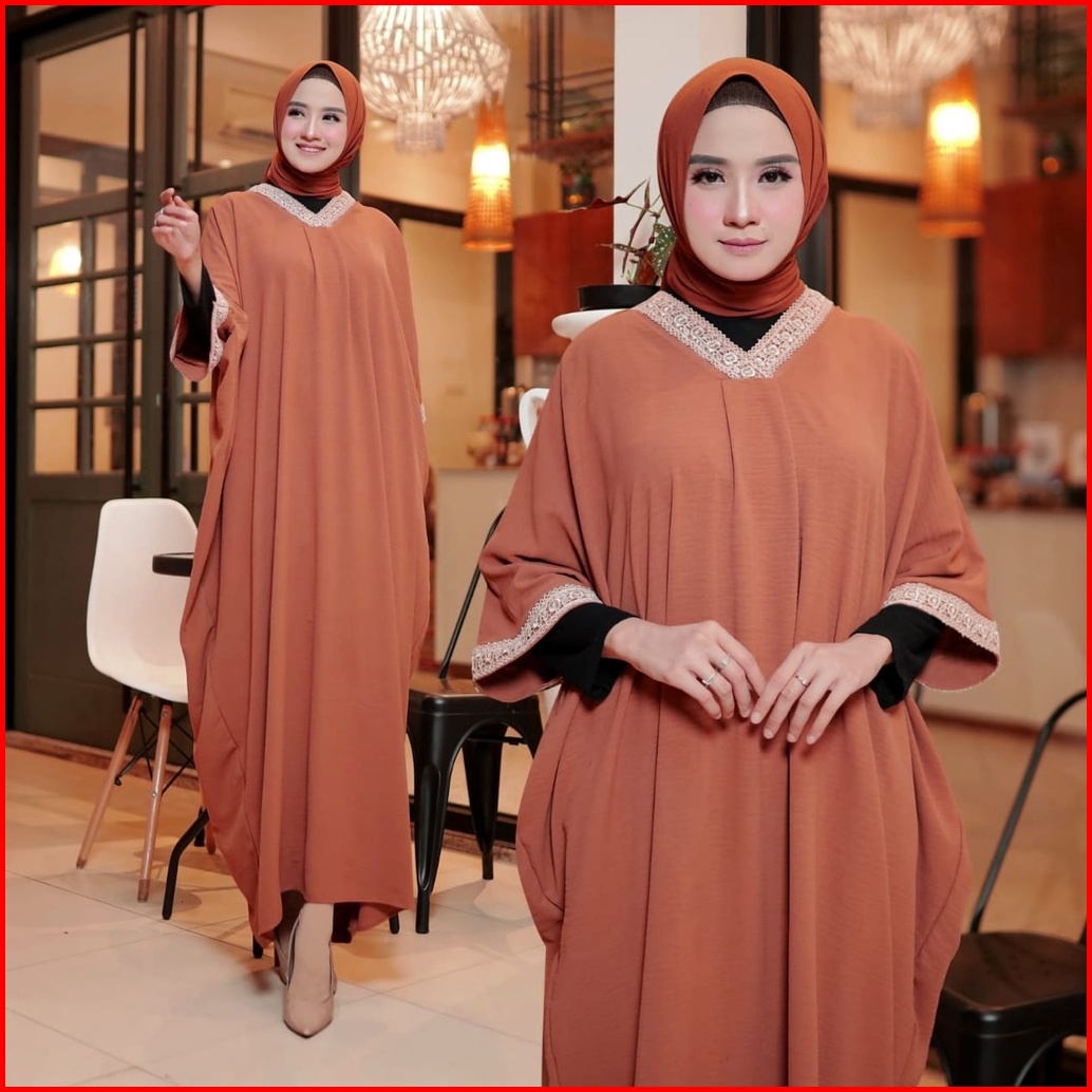 Hopylovy - Kaftan Wanita Muslim Bahan Crinkle Aplikasi Brenda Coklat Ishana