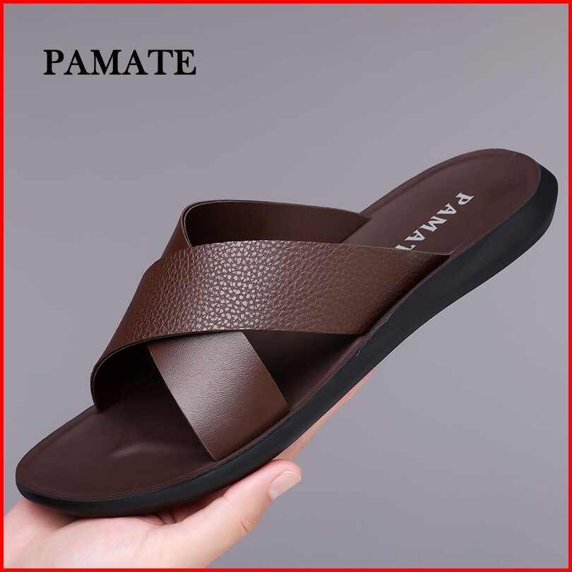 Sandal Pria Kulit Hitam Selop Slip On Casual - Anti Selip Nyaman