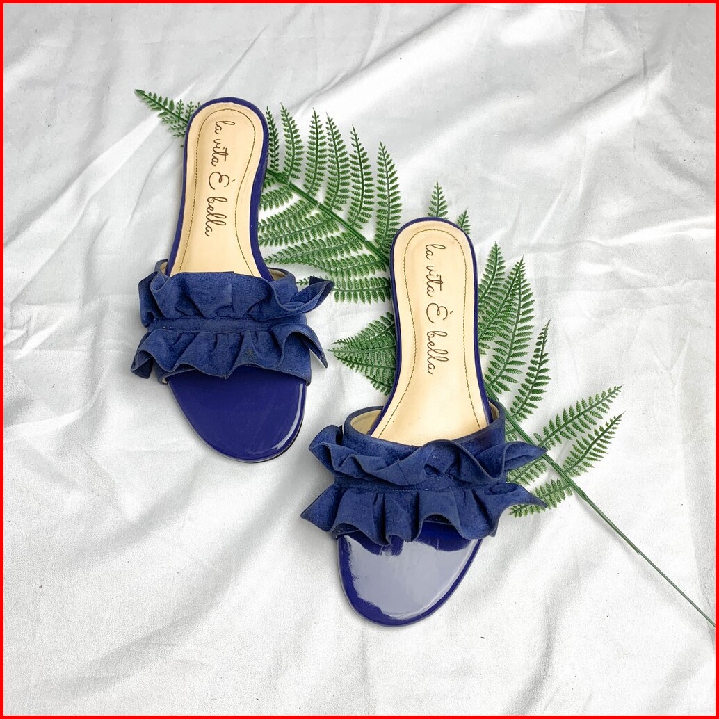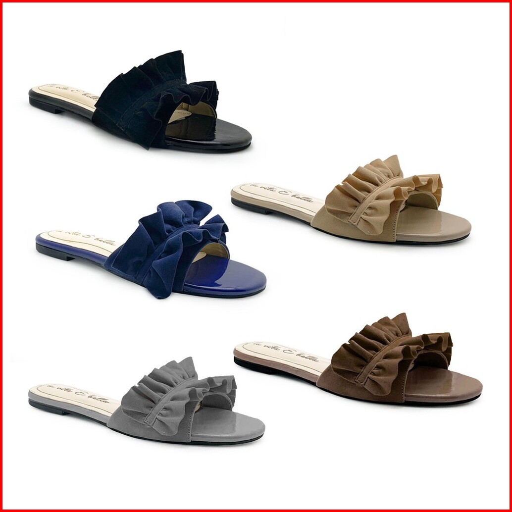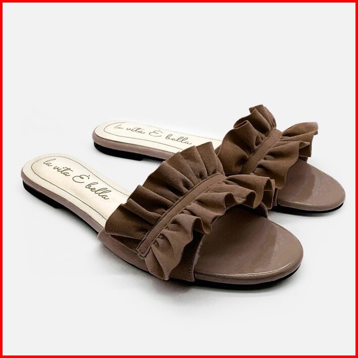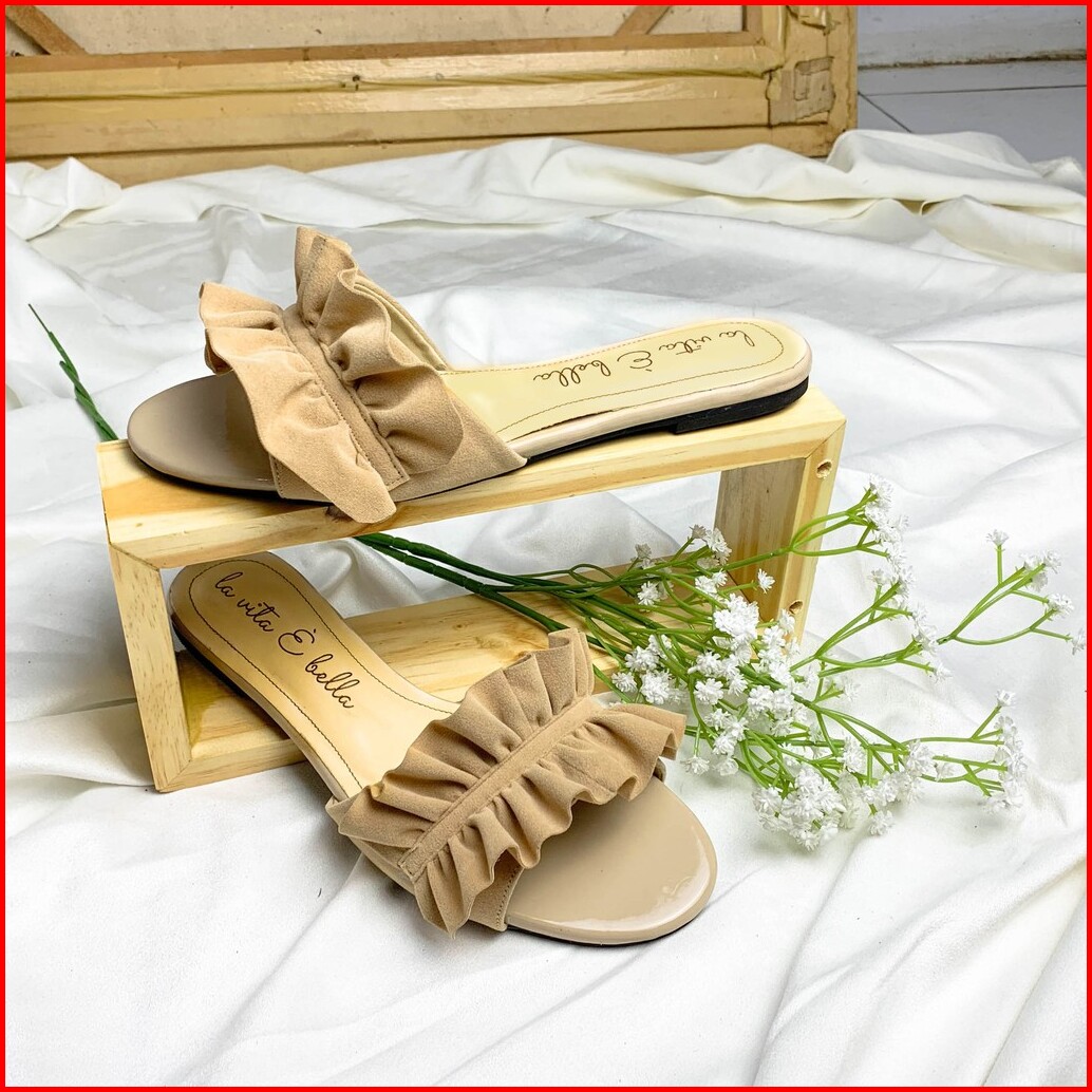 La Vita E Bella Peony Sandal Flat Teplek Wanita Model Ruffle Bahan Suede Vevet Lp501
