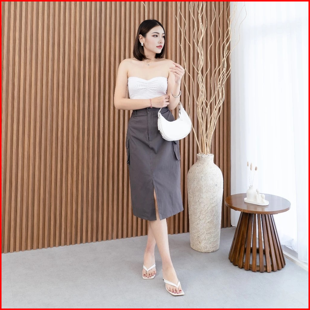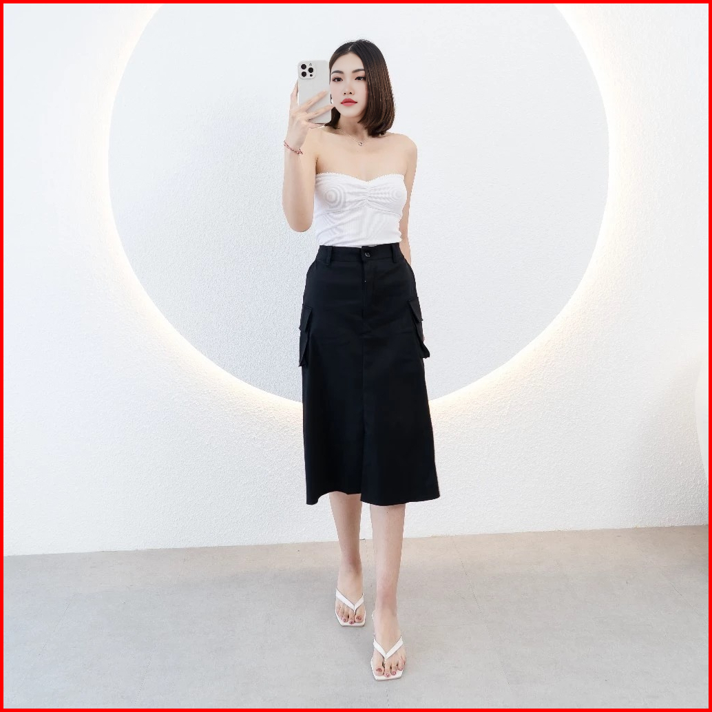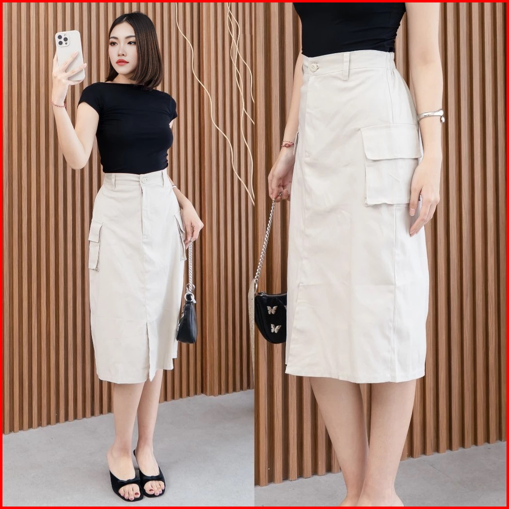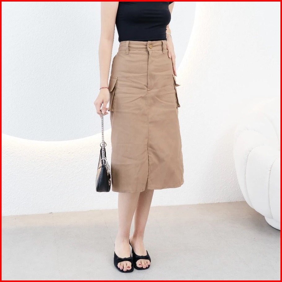 Rok Kargo Midi Cassa Skirt Cargo Highwaist 7 8 Karet Belakang Bahan American Drill