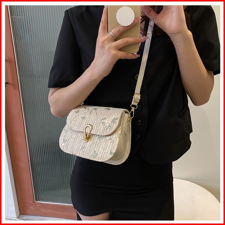 Bao055 Tas Totebag Wanita Bahan Anyam Jerami Model Cina Bunga Fashion Cina Bahan Anyaman Tas Anyaman Cina Pita Tas Casua