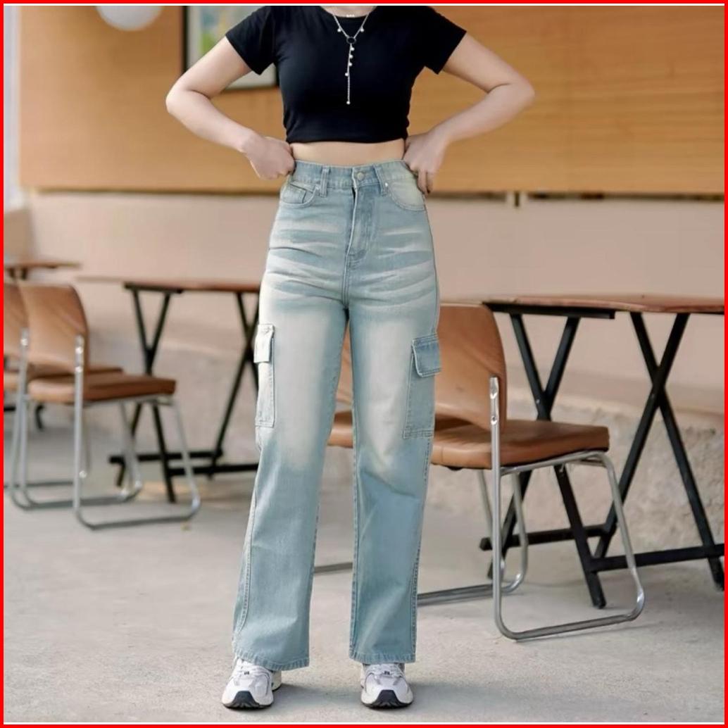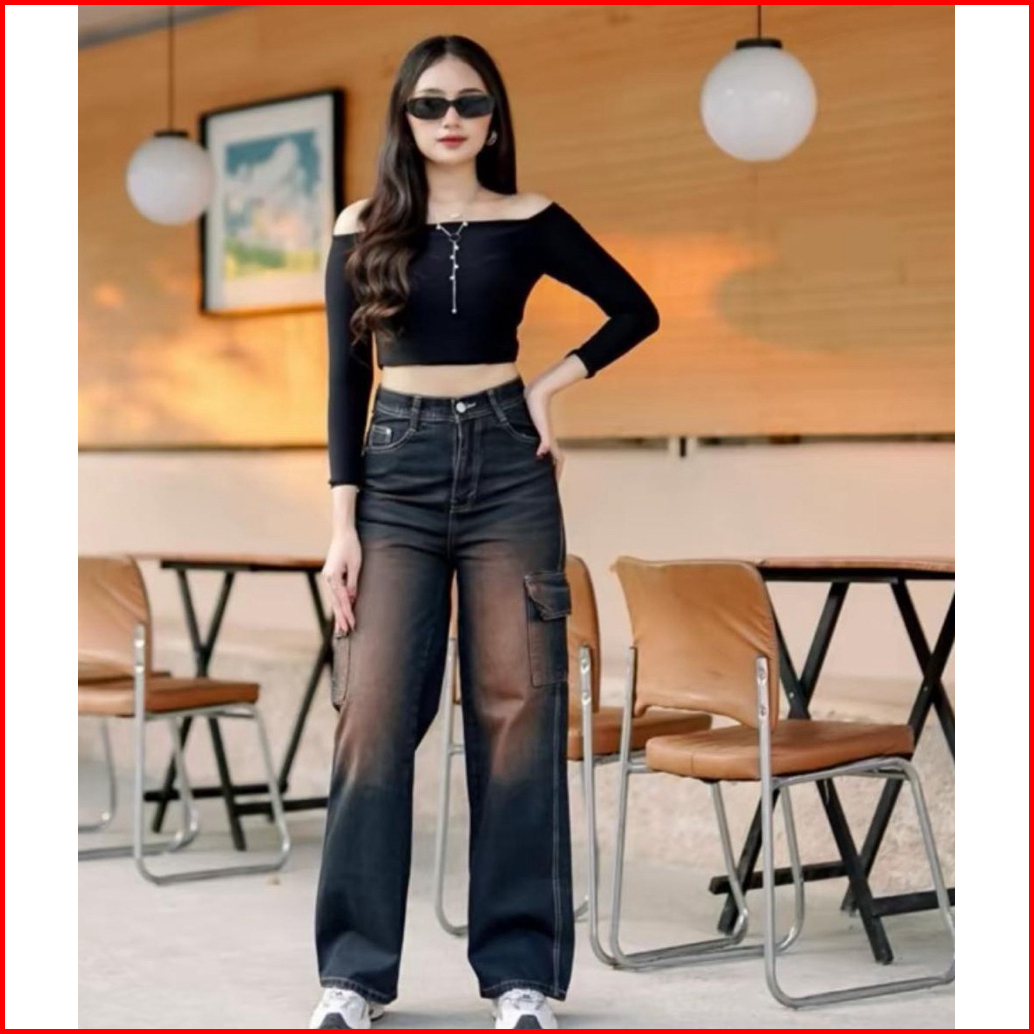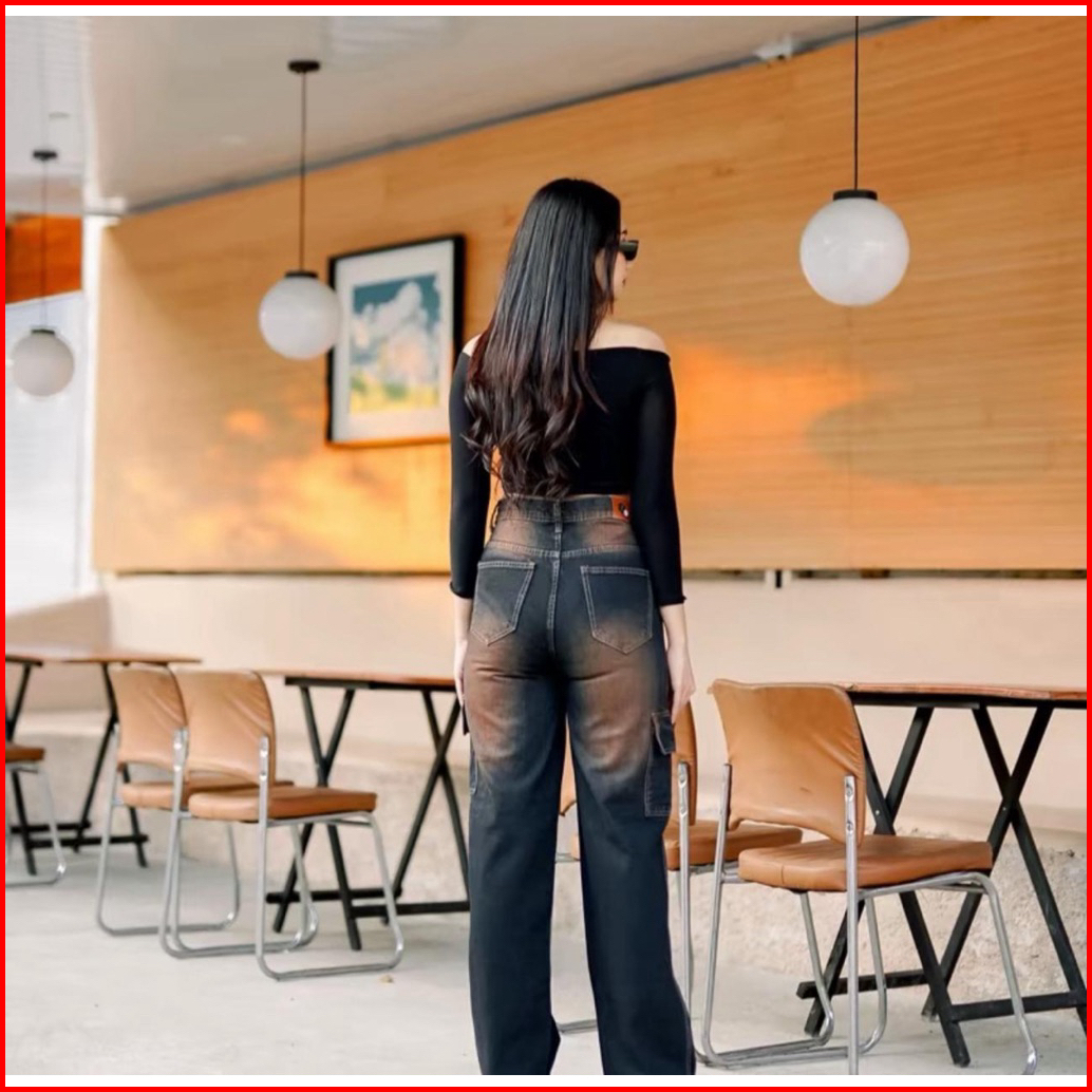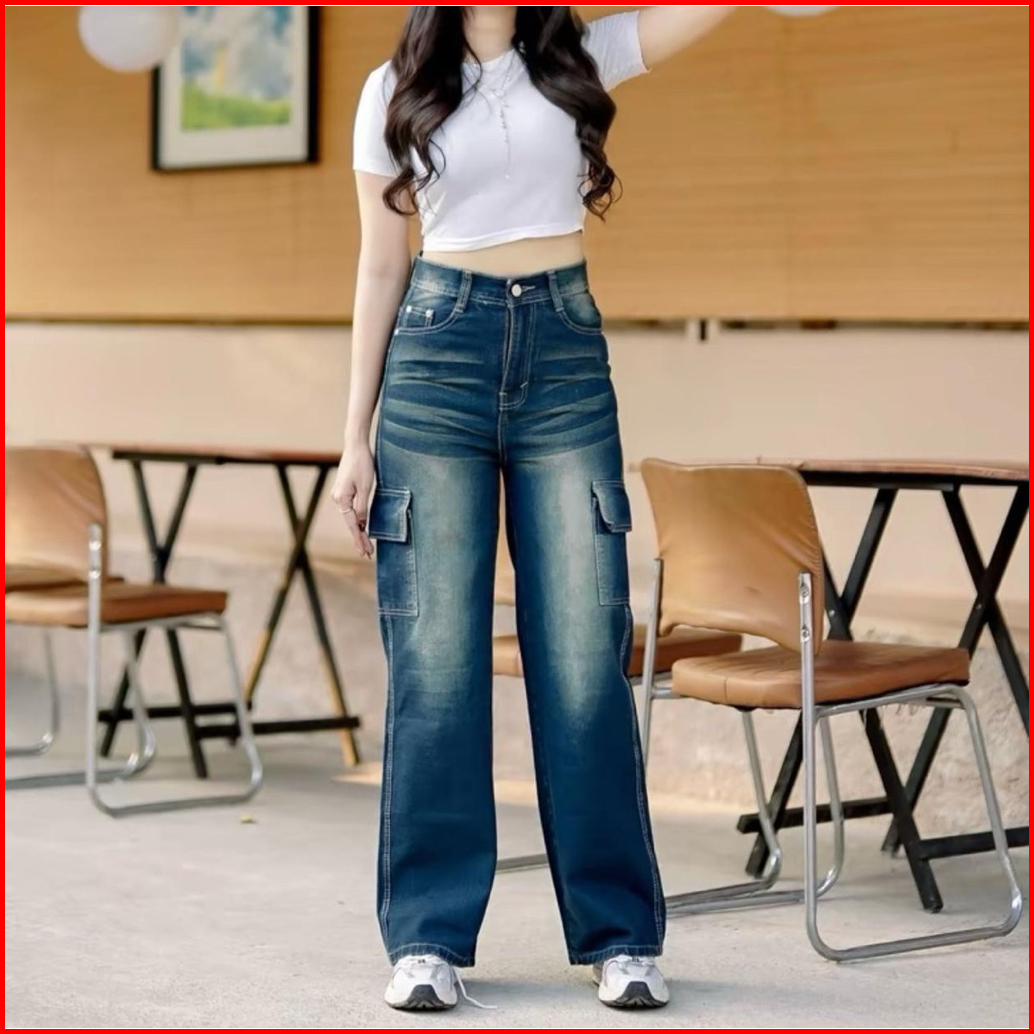 Highwaist Baggy Cargo Loose Jeans Wanita Premium