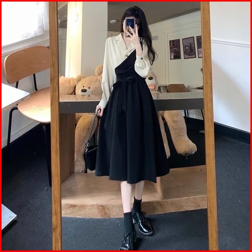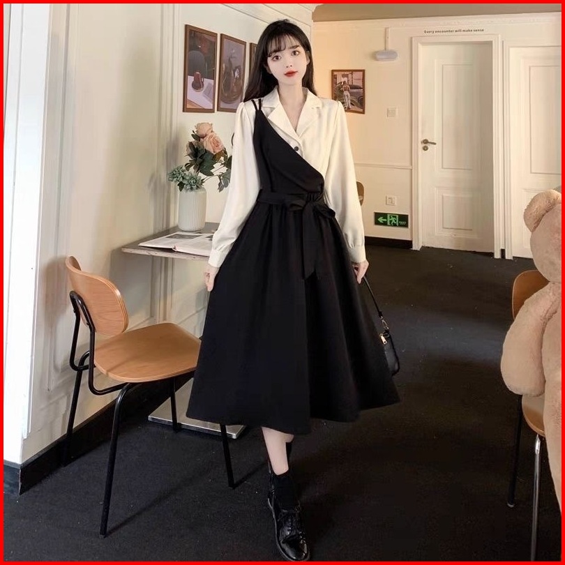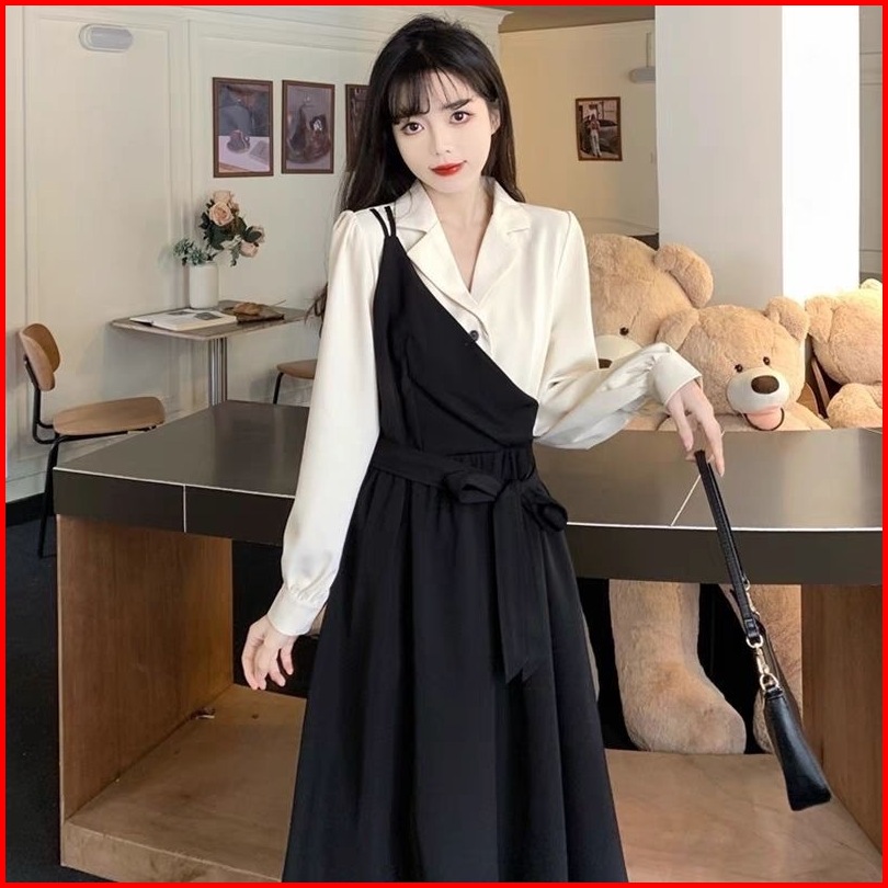 First Girl-dress Korea Terbaru 2024 Model Menyatu Kekinian V-neck Lengan Panjang - Casual Daily Outfit Wanita Premium Qu