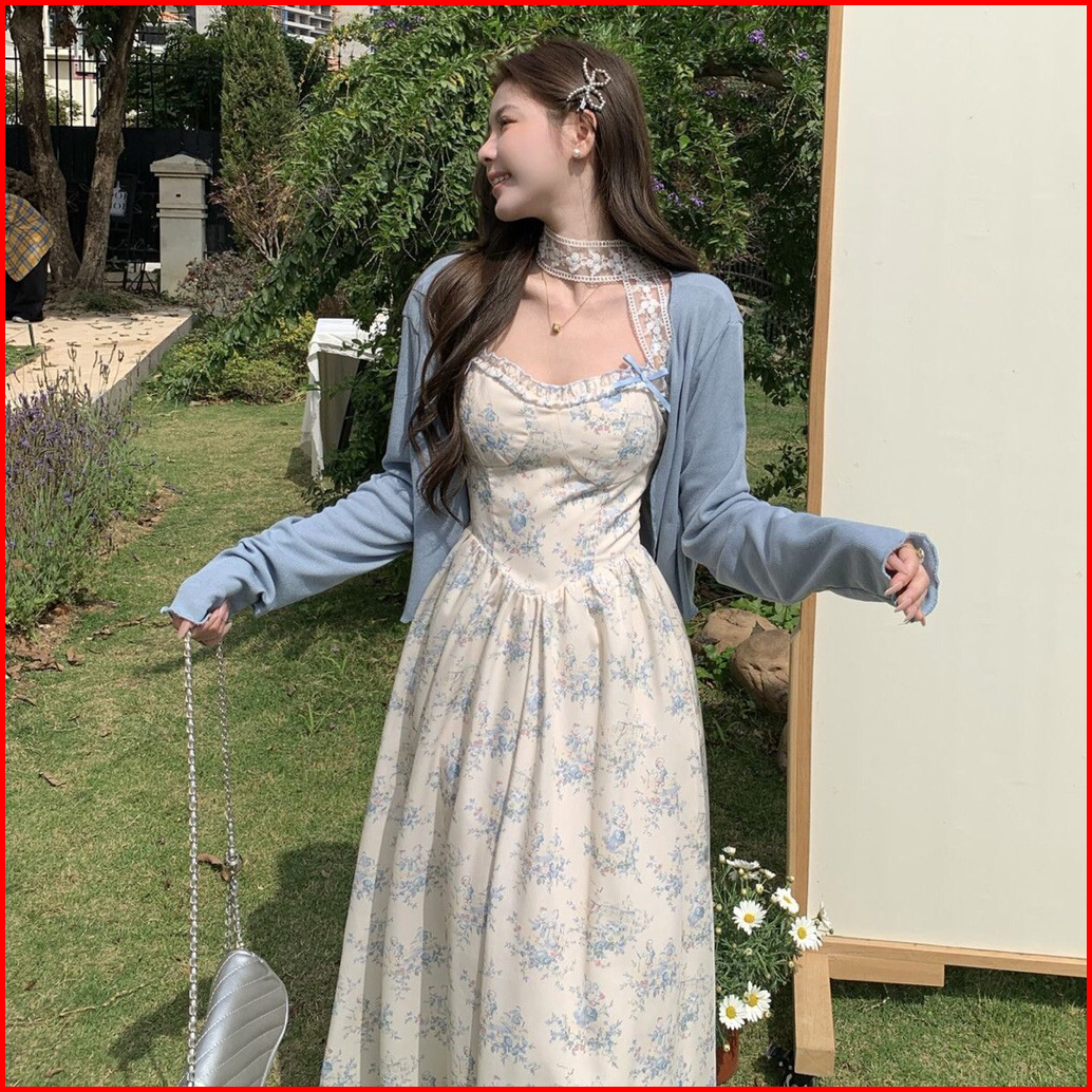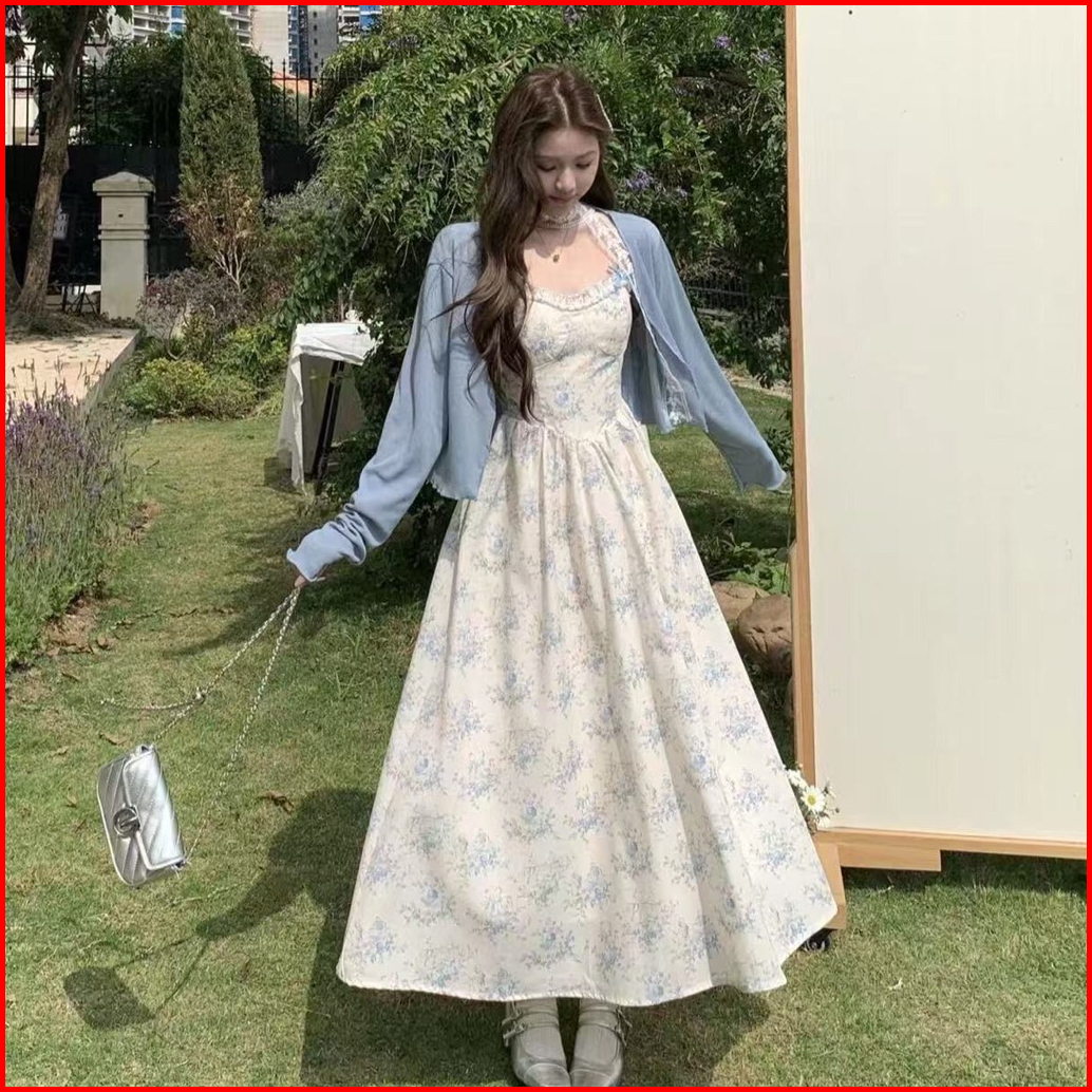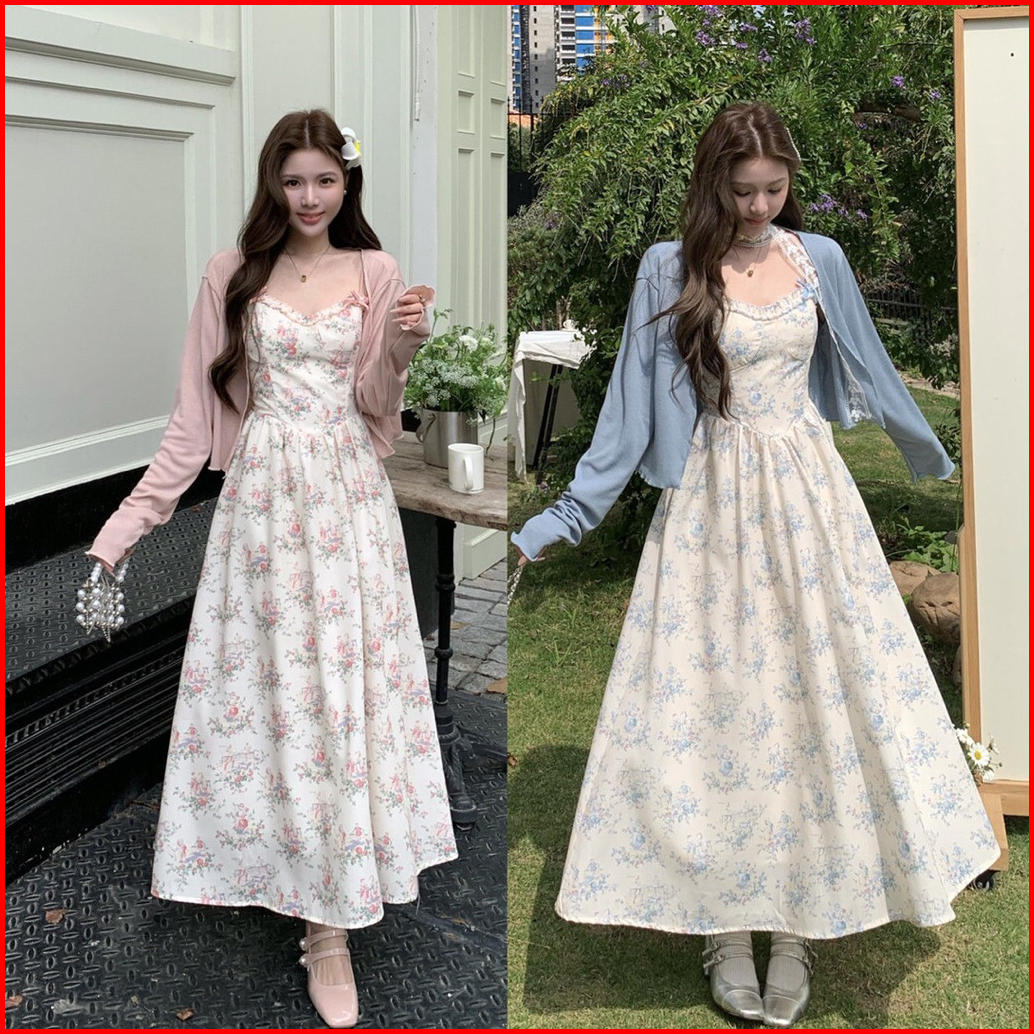 First Girl - Setelan Dua Potong Gaun Suspender Manis Rok Panjang Motif Bunga Ukuran Besar Cardigan Dress Wanita Musim Pa