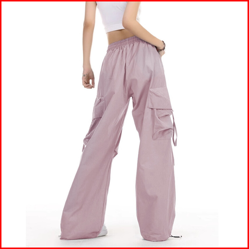 Celana Cargo Lurus Pinggang Tinggi Gaya Korea Kulot Serut Pink Kasual Wanita