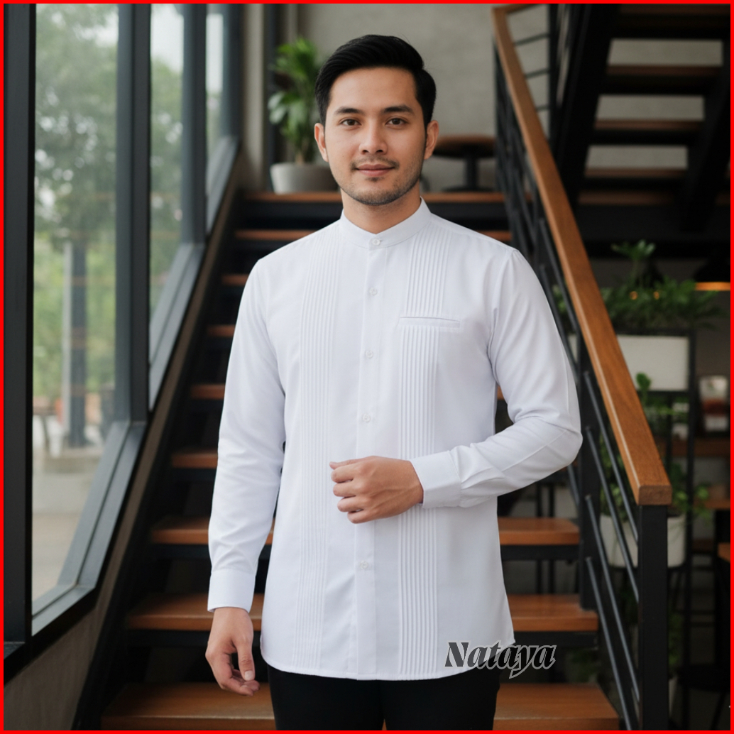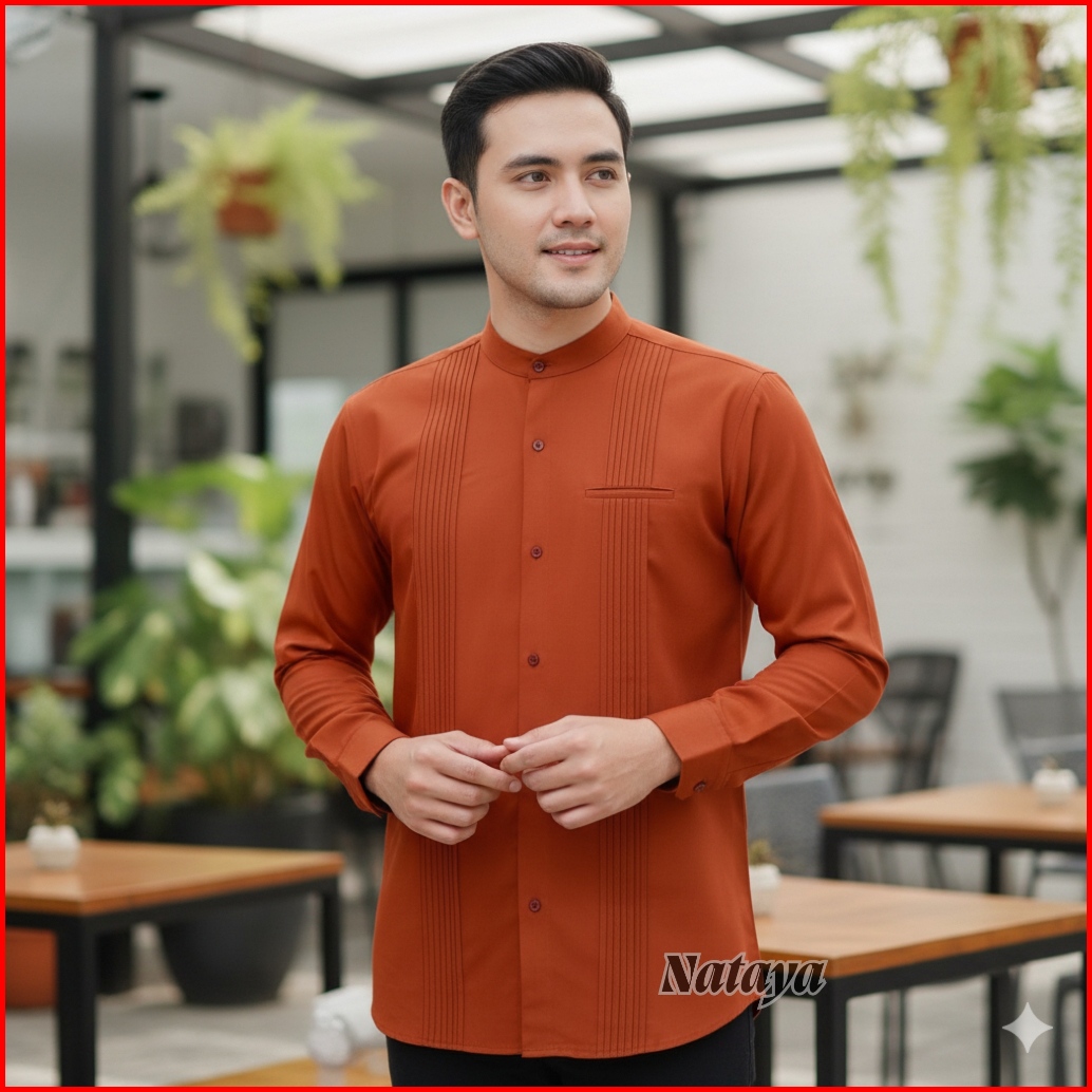 Baju Koko Pria - Koko Lengan Panjang Motif Abyan Warna Cokelat Bahan Katun Toyobo Premium Adem