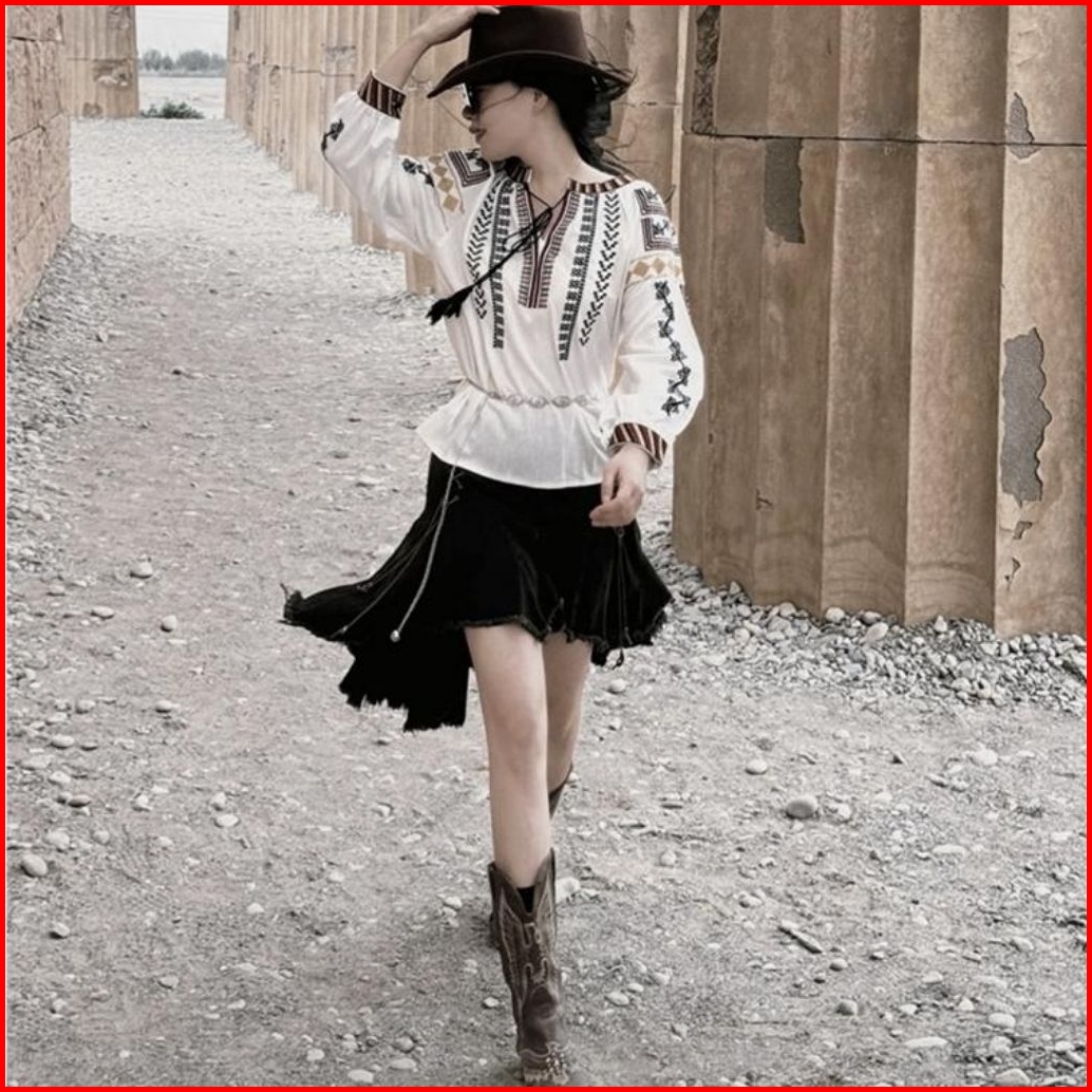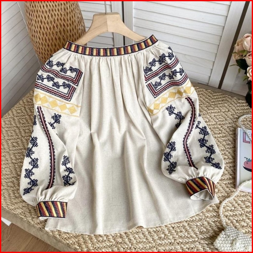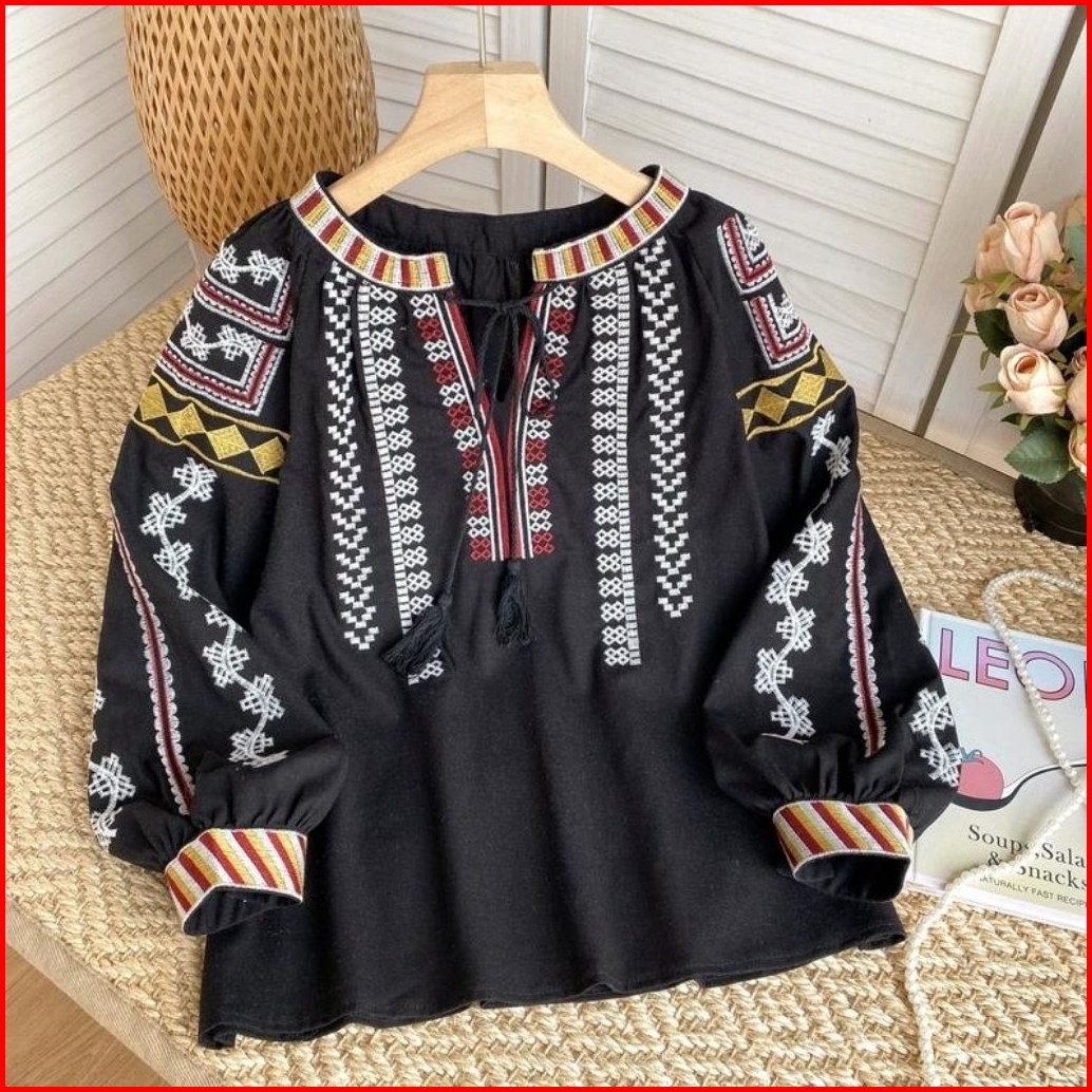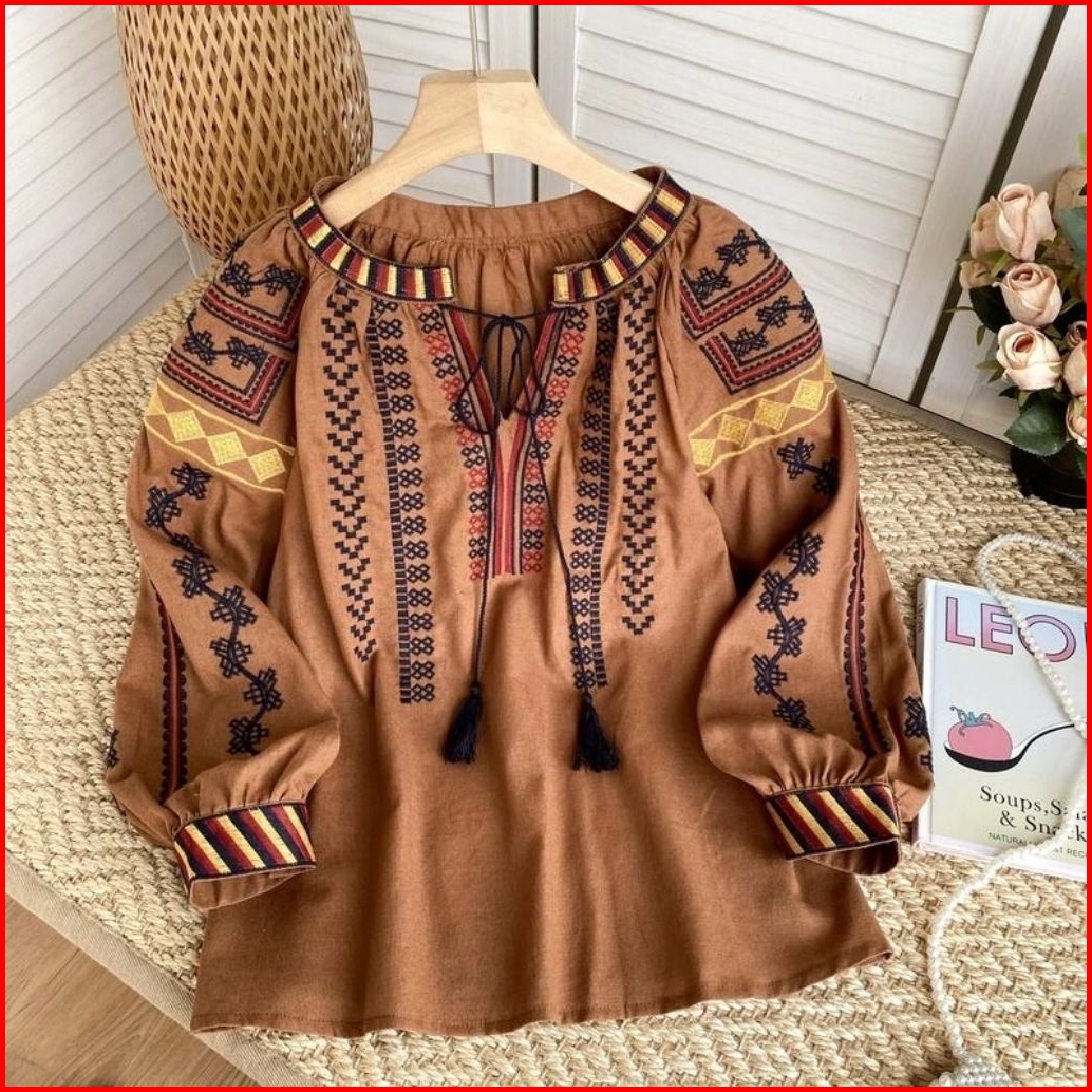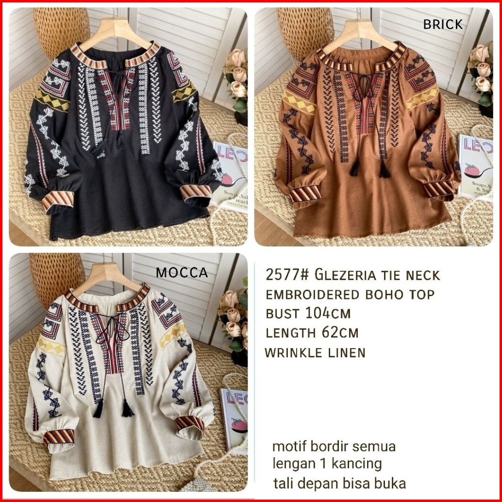 2577 Baju Atasan Blouse Glezeria Tie Neck Embroidered Boho Top Bordir Korean Style Wanita Premium Import Bangkok Bkk Baj
