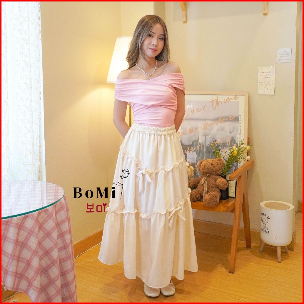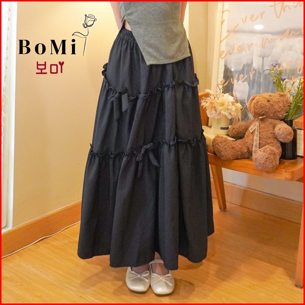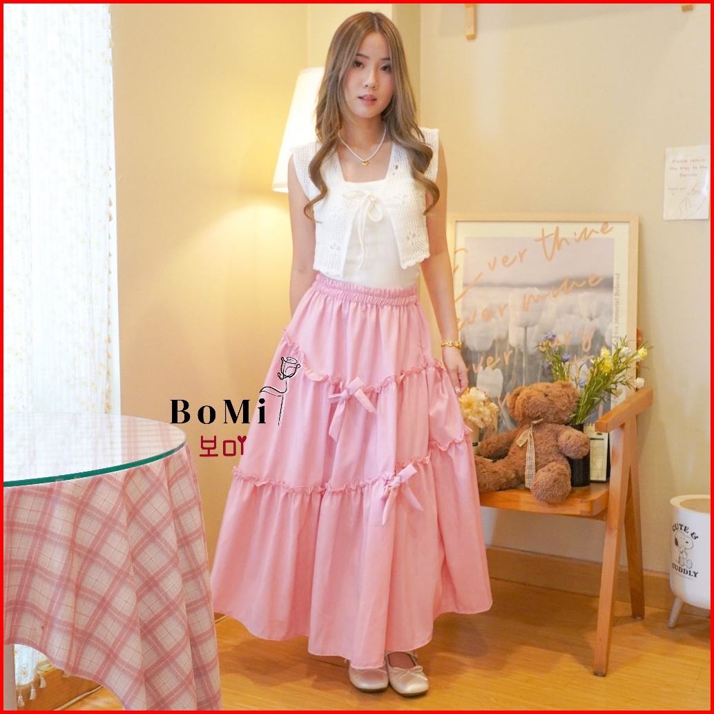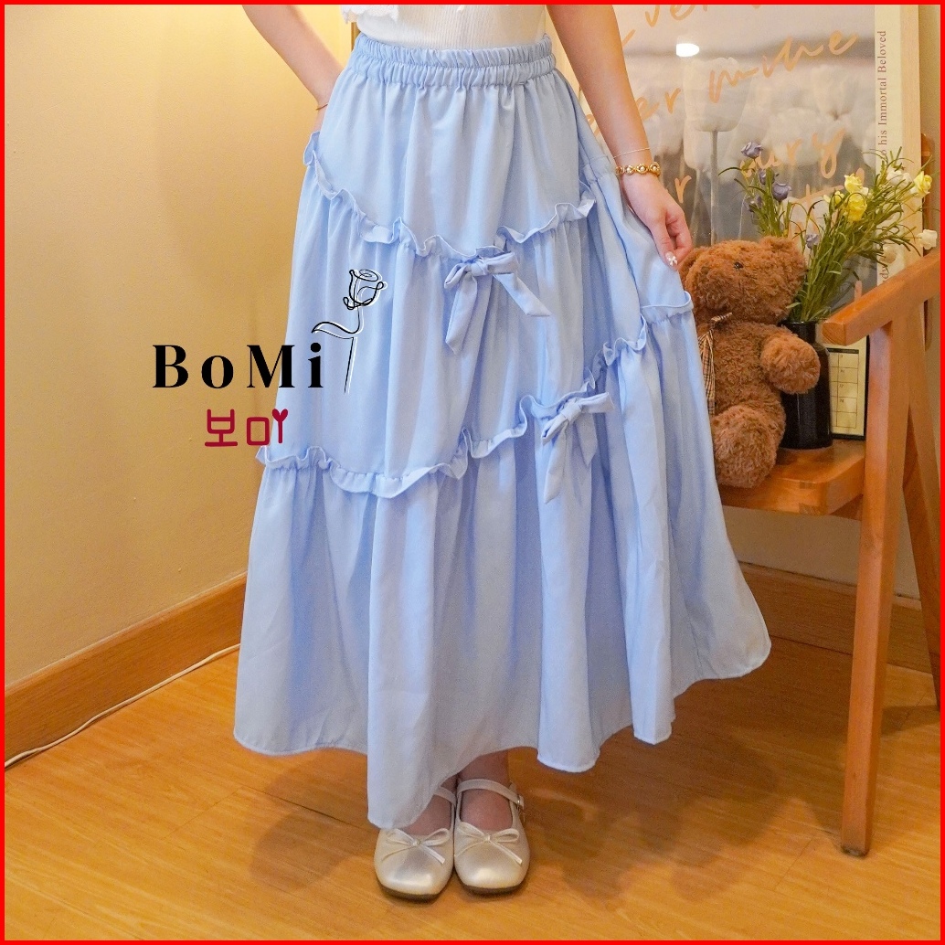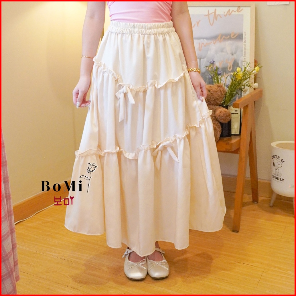 Bomi - Lily Skirt Maxi Korean Katun Bordir Rok Panjang Wanita Tingkat Susun Pita Premium Dengan Furing Nyaman Full Karet
