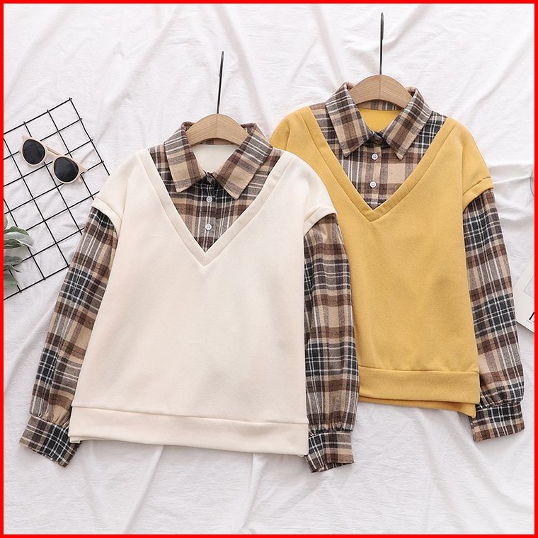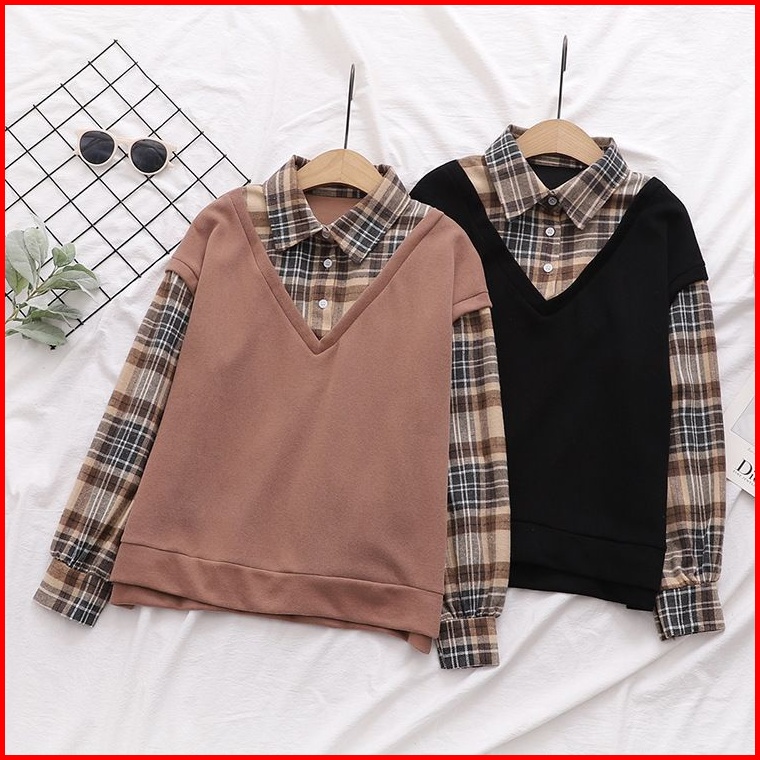 Femes Kimberly Flanel Blouse Combi Fold Terry Shirt Atasan Kemeja Flannel Top Muslim Wanita Premium Korean Style