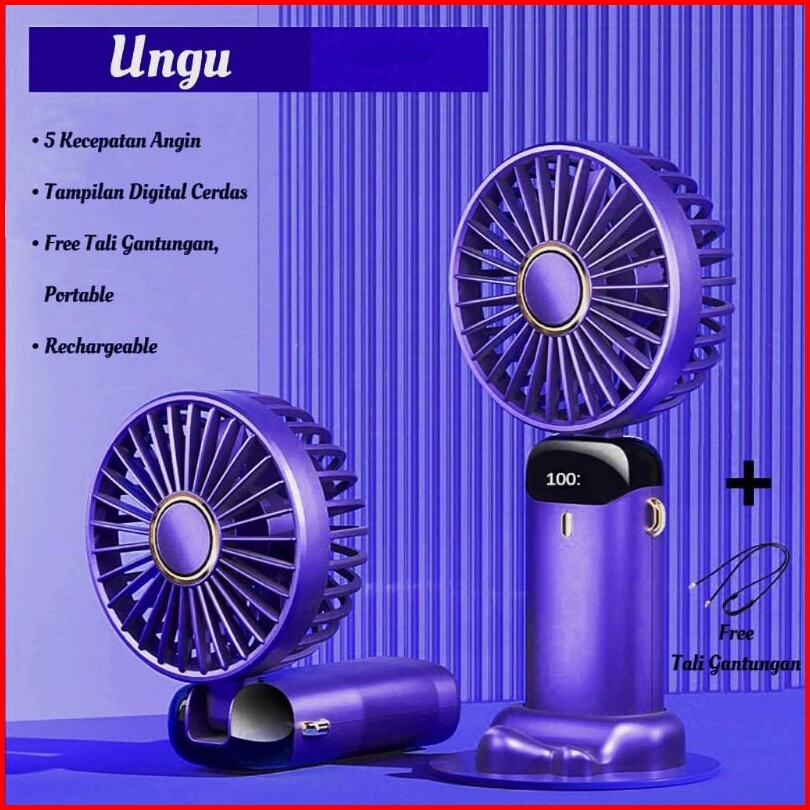 Kipas Angin Genggam Mini Lipat Fan Lucu Led Display 18650 Lithium Baterai Gratis Gantungan Tali Leher 5 Kecepatan Handhe