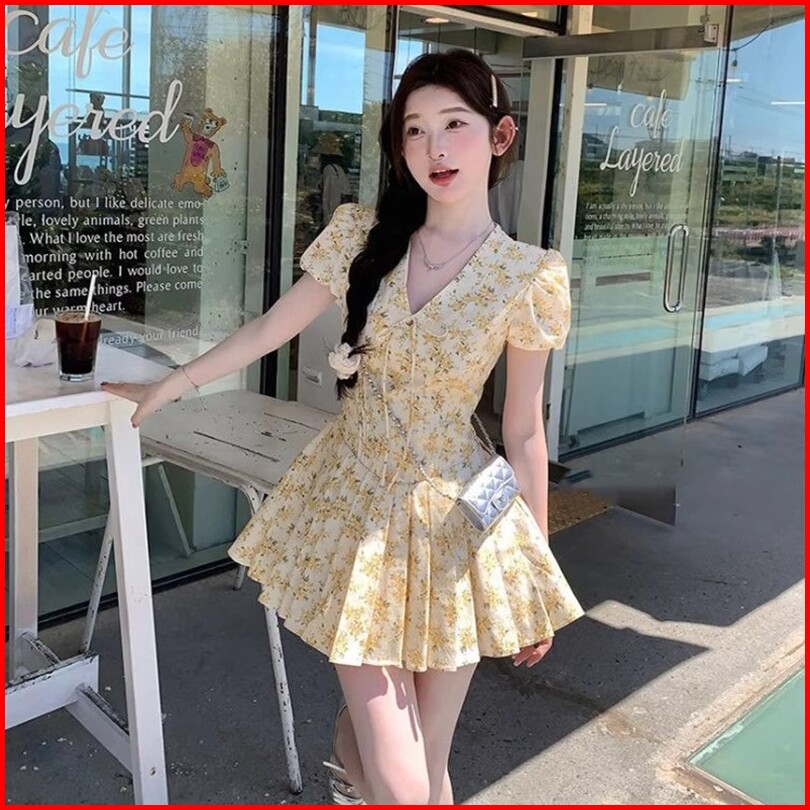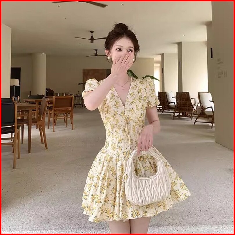 Air Qz256 Midi Dress Korea Gaun Bunga Wanita Lembut Prancis Lengan Gelembung Rok Sifon Rok Cinta Pertama Floral Vintage