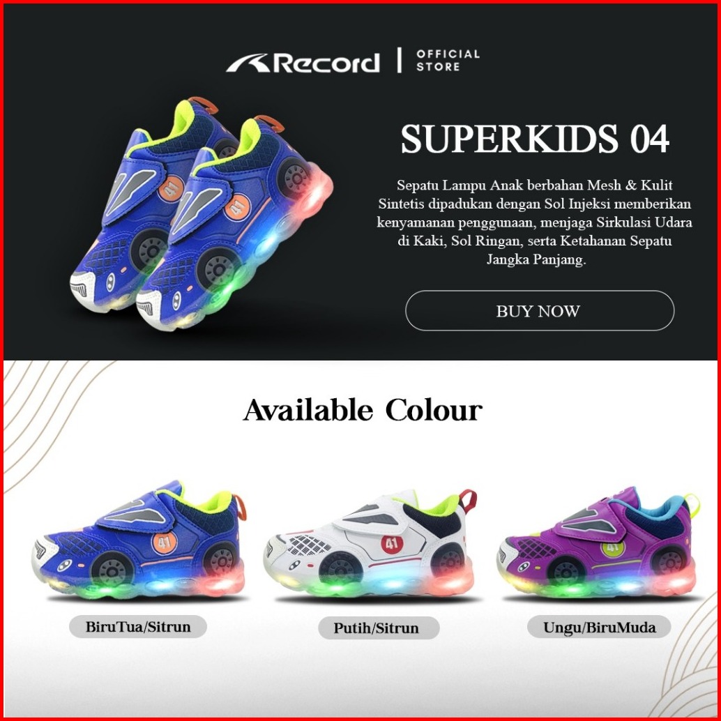 Record Super Kids 04b Fashion Sepatu Lampu Anak Laki Led Paud Velkro 1-7 Thn Mobil Motobike 26-31