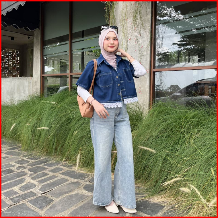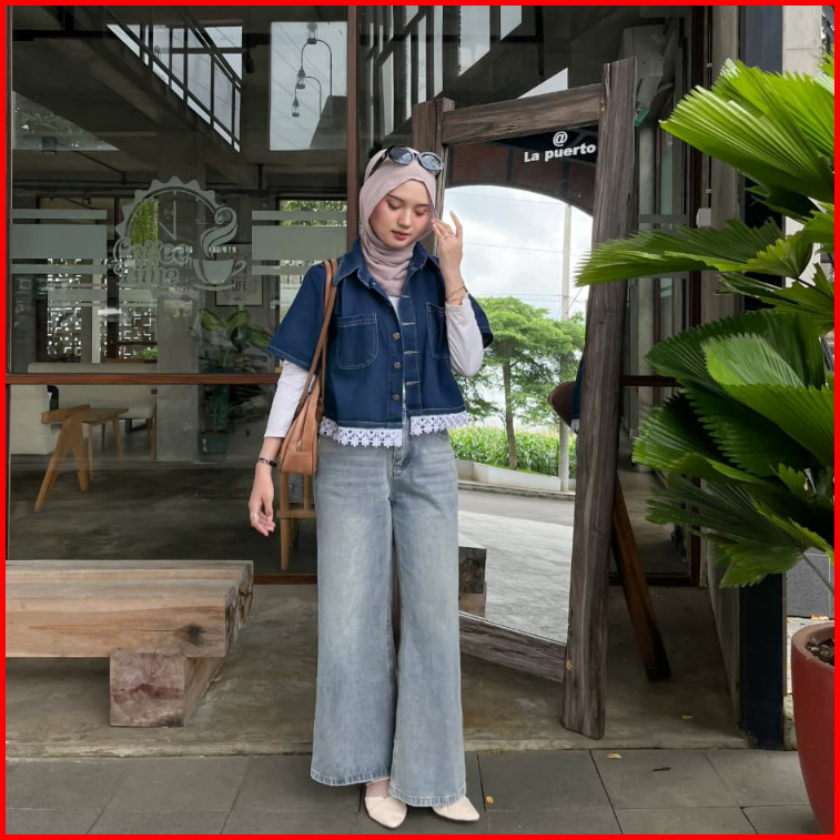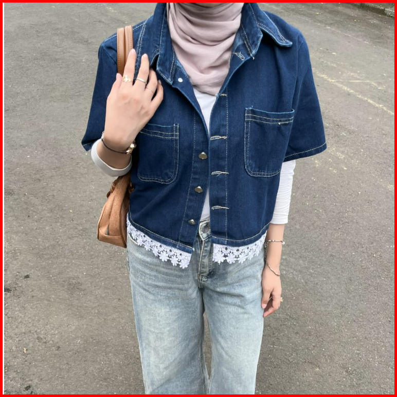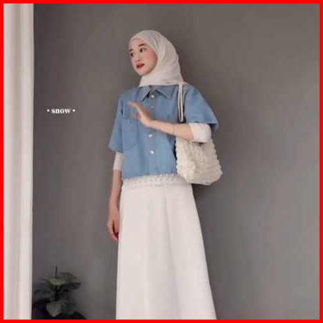 Pola Wear Selina Kemeja Crop Denim Wanita Lengan Pendek Crop Shirt Denim Wanita Korean Crop Casual