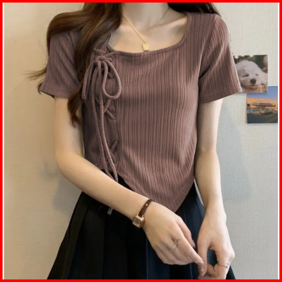 99koutlet Women T-shirt Short Sleeve Square Neck Drawstring 1807 S M L