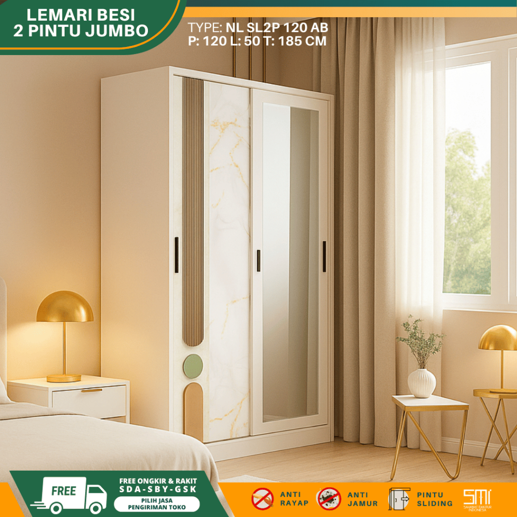 Lemari Besi 2 Pintu Jumbo - Lemari pakaian, lemari besi 120cm, Lemari Baju Sliding, Metal Wardrobe