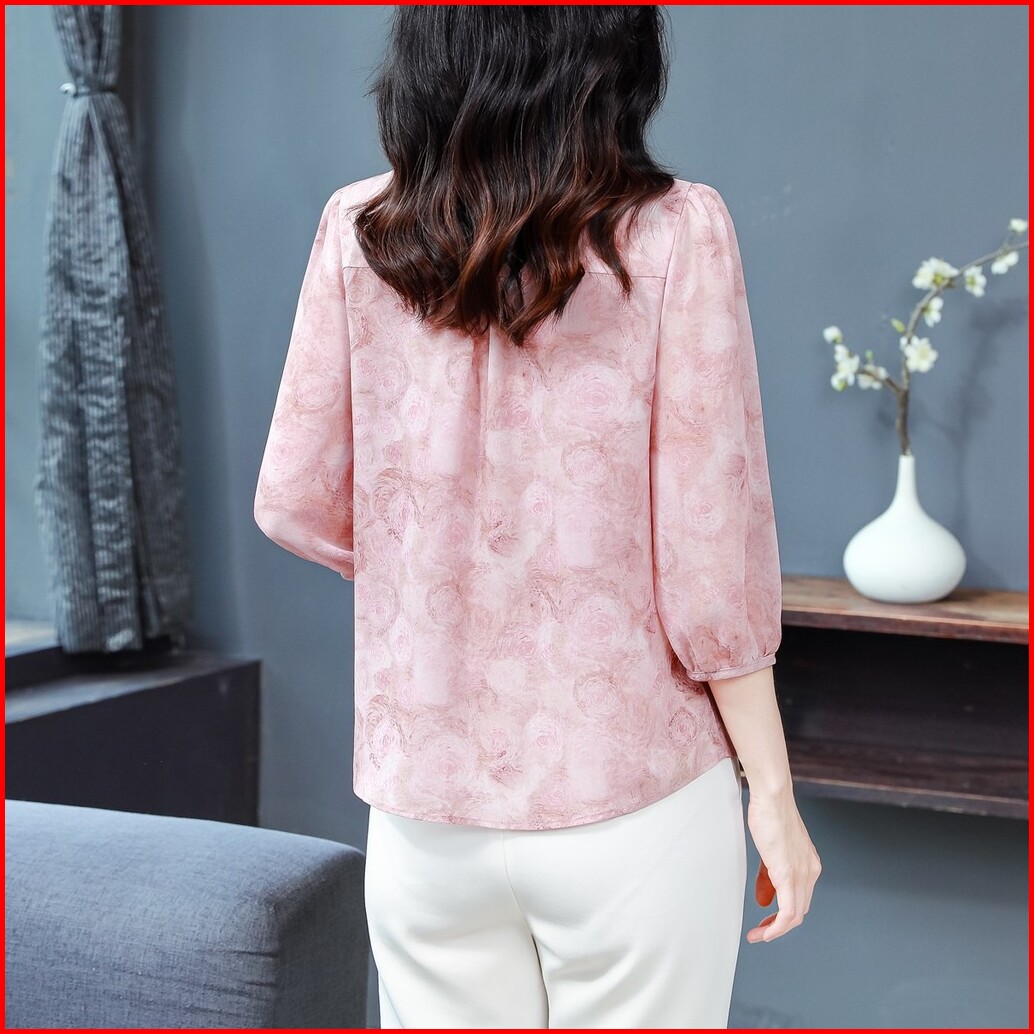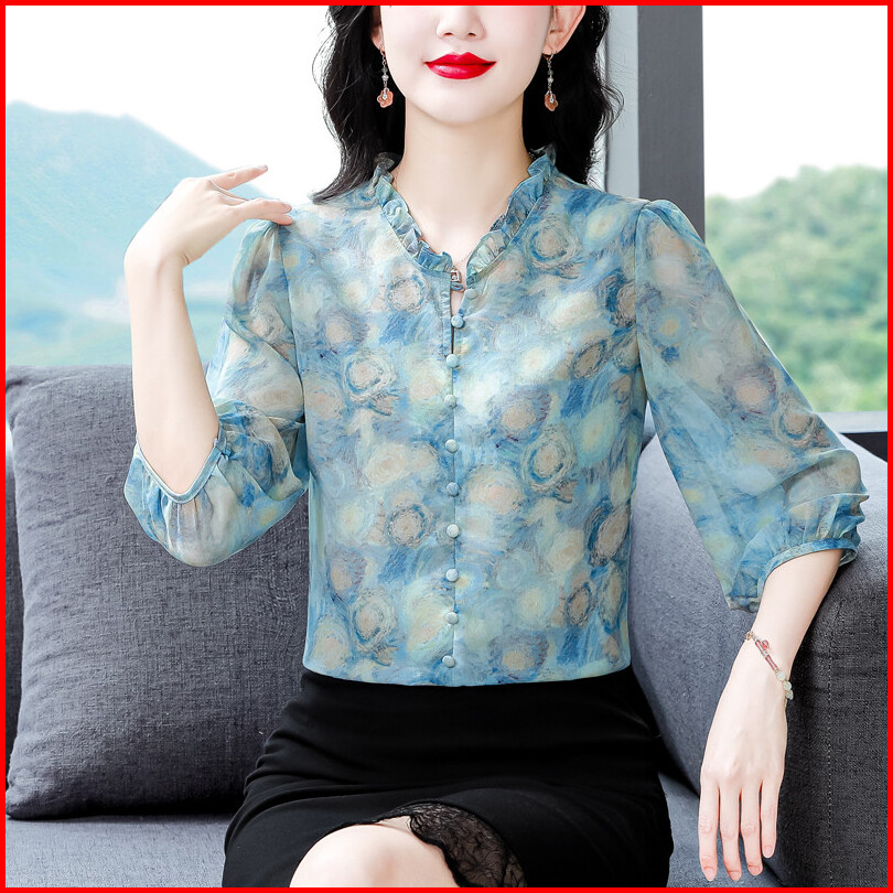 Bebovizi Blus Kasual Korea Fashion Lengan 3 4 Kemeja Wanita Sifon Biru Muda