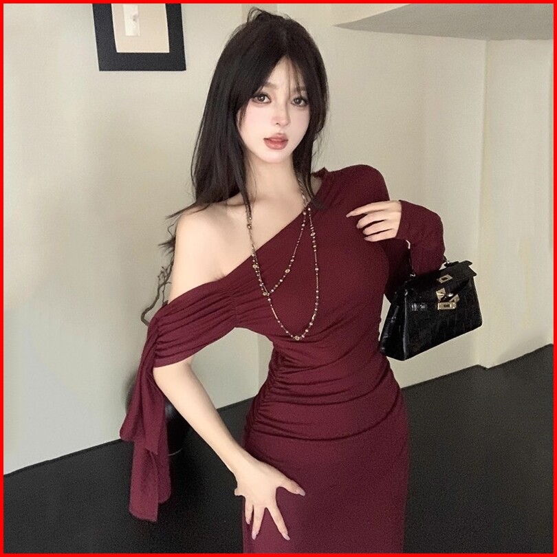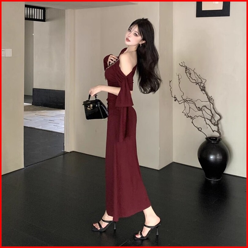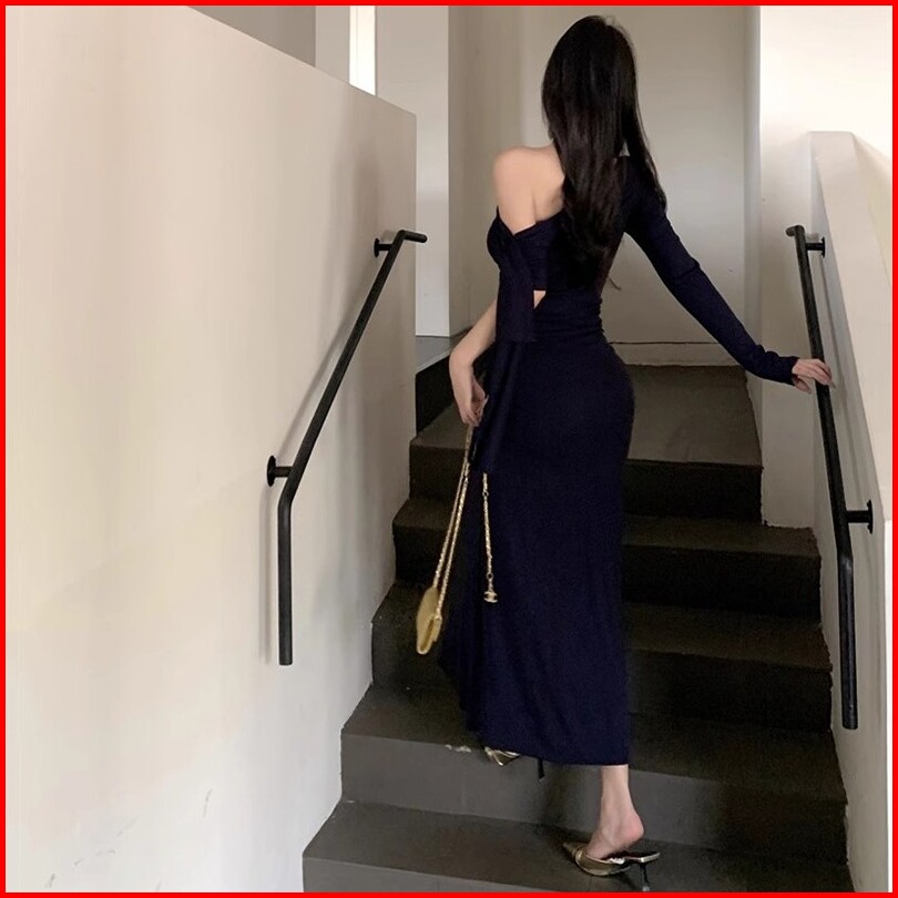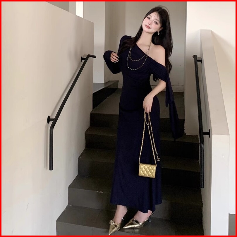 Air Qz249 Casual Long Dress Wanita Dress Panjang Off Shoulder Rib Knit Terusan Tangan Panjang Sabrina Dress Korean Basic