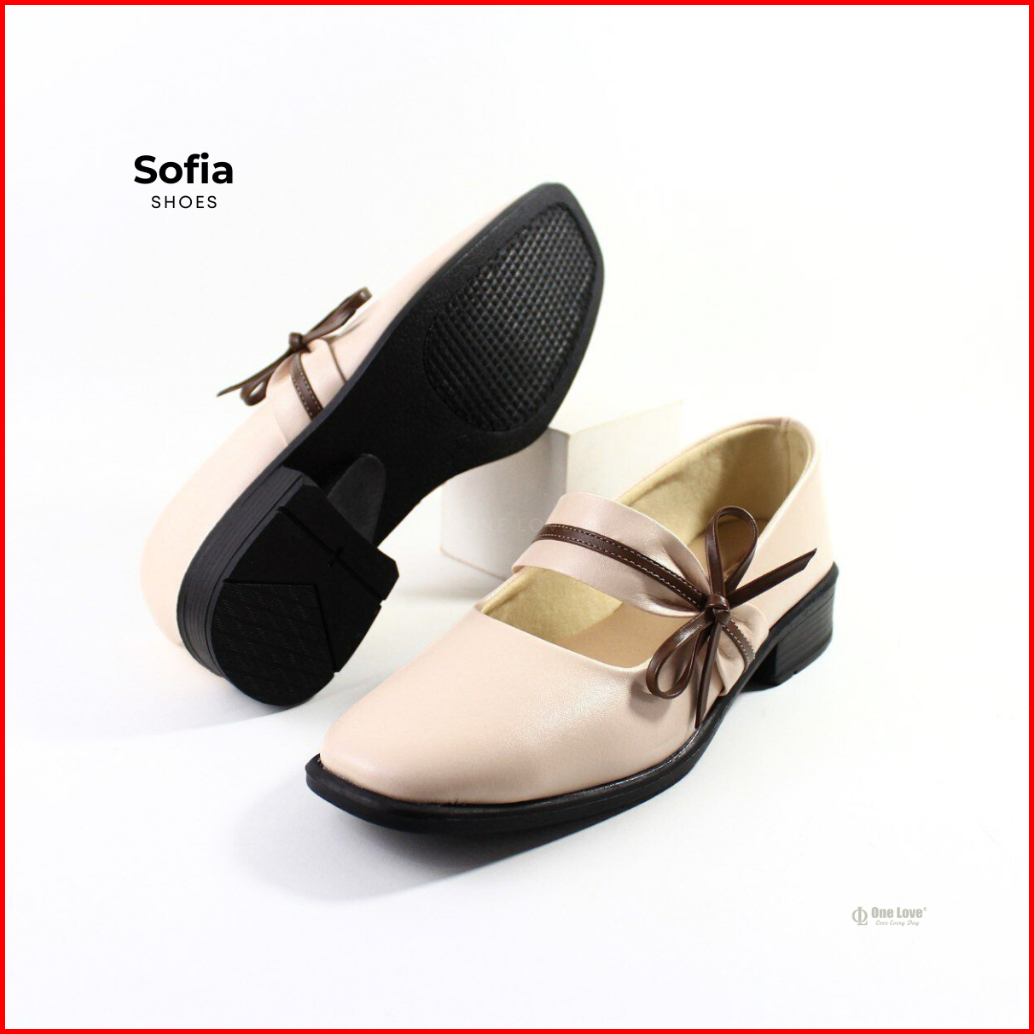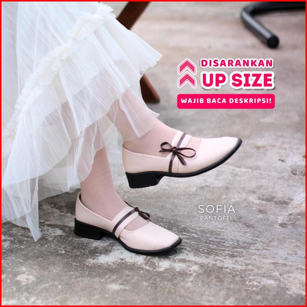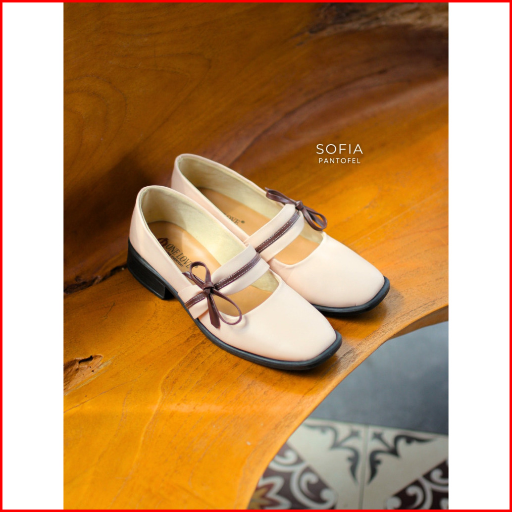 One Love Sofia Ivory - Sepatu Pita Korean Style Pantofel Wanita Mary Jane Kulit Sintetis Anti Slip Sol Karet Ringan Hak