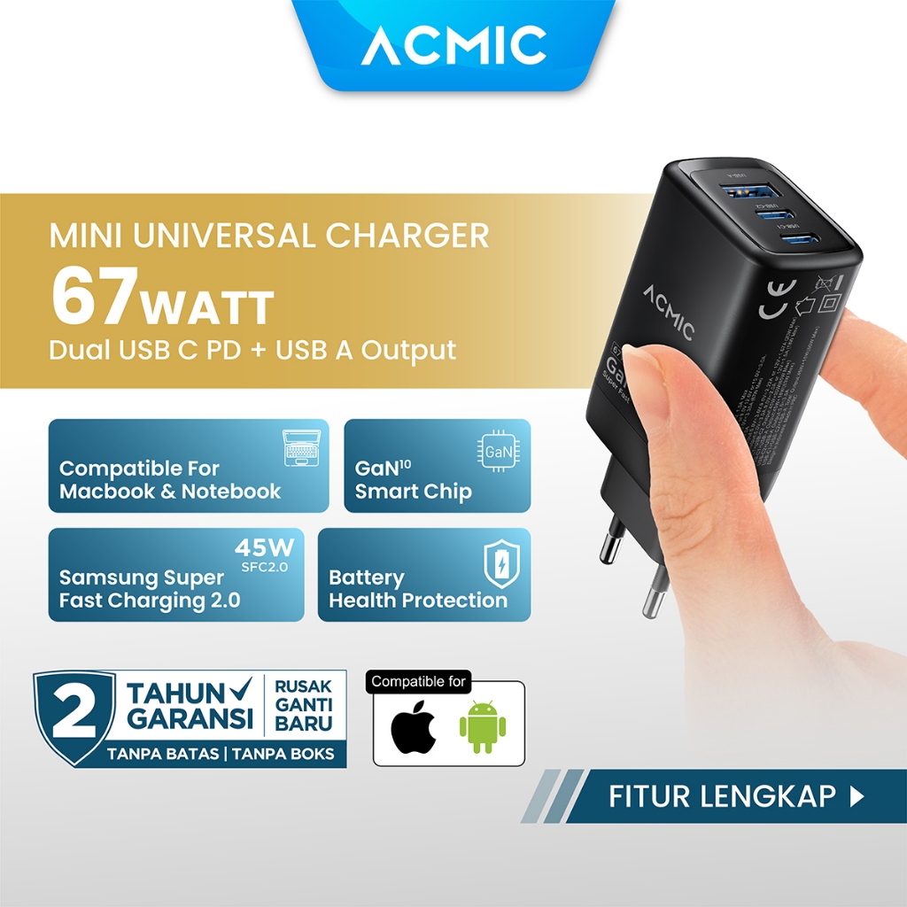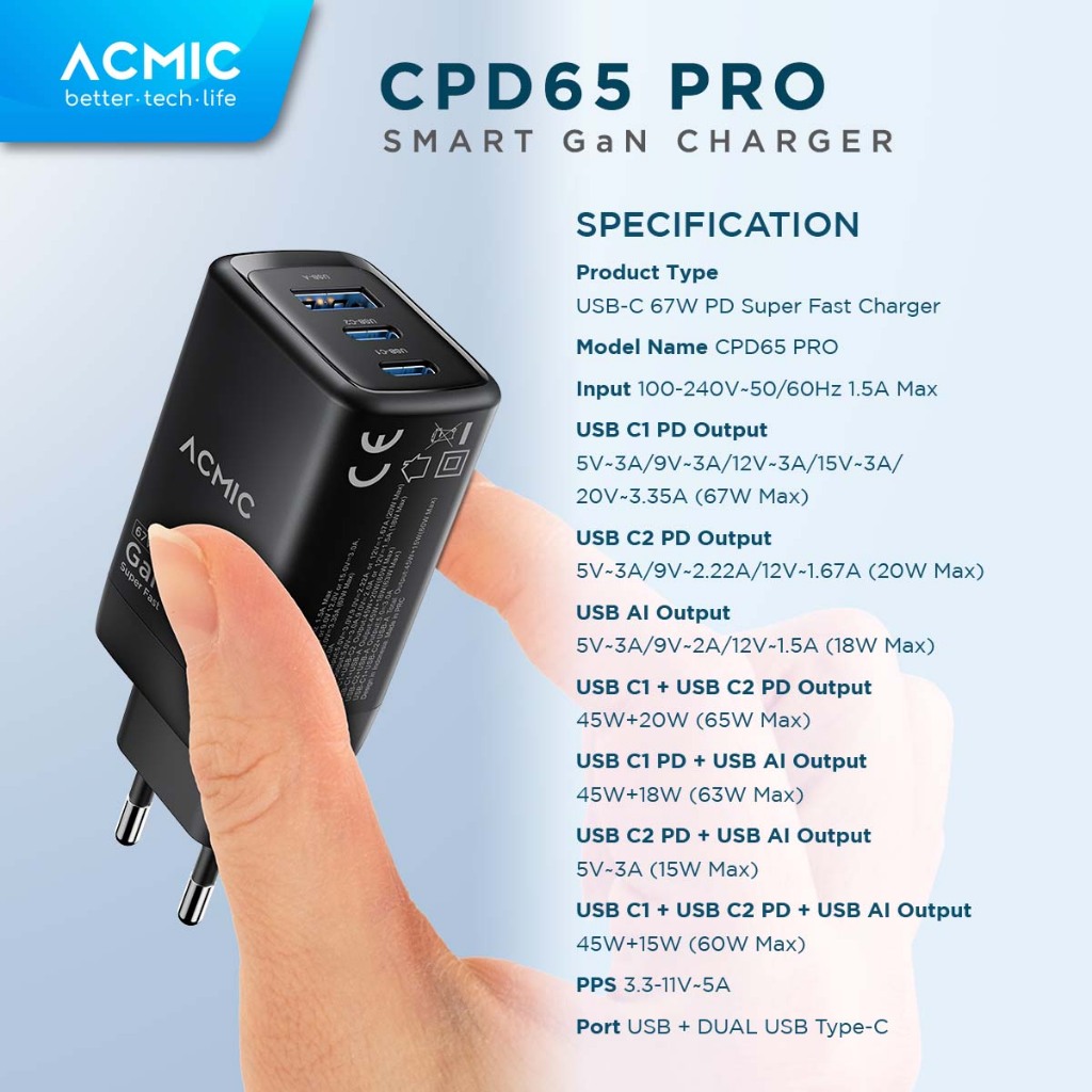 ACMIC CPD65 GAN TYPE C 65W KEPALA CHARGER SUPER FAST CHARGING ADAPTOR