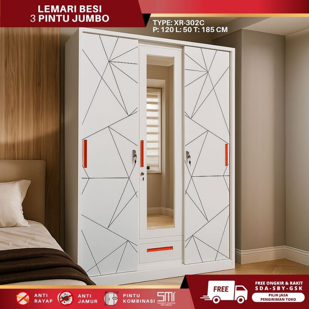 Lemari Pakaian Besi 3 Pintu Sliding Swing 120cm – Lemari Baju Anti Rayap & Tahan Lama