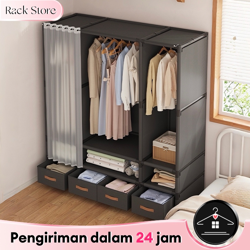 Dengan L Lemari Pakaian Lemari Kain Sederhana Portable Lemari baju Tahan Debu dengan tirai geser