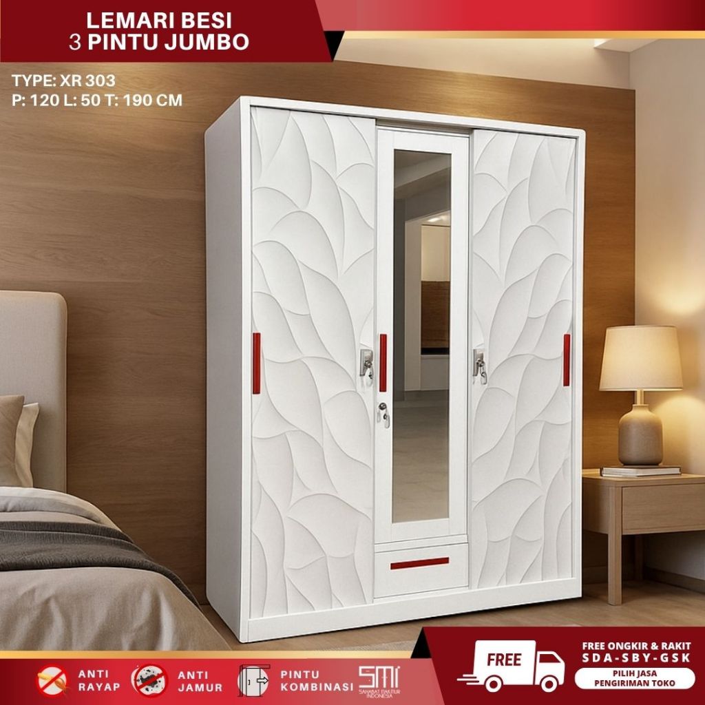 Lemari Pakaian Besi 3 Pintu Sliding Swing 120cm – Lemari Baju Anti Rayap & Tahan Lama