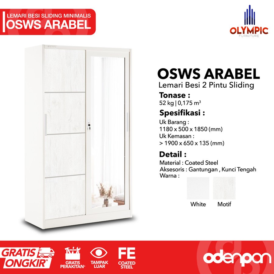 OLYMPIC OSWS ARABEL Lemari Pakaian Baju 2 Pintu Besi Sliding Putih Minimalis Dengan Cermin & Motif Kayu