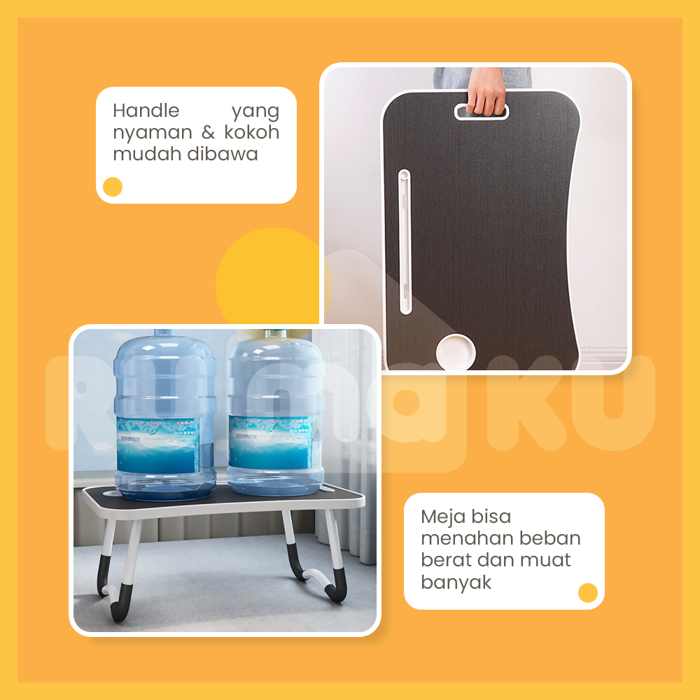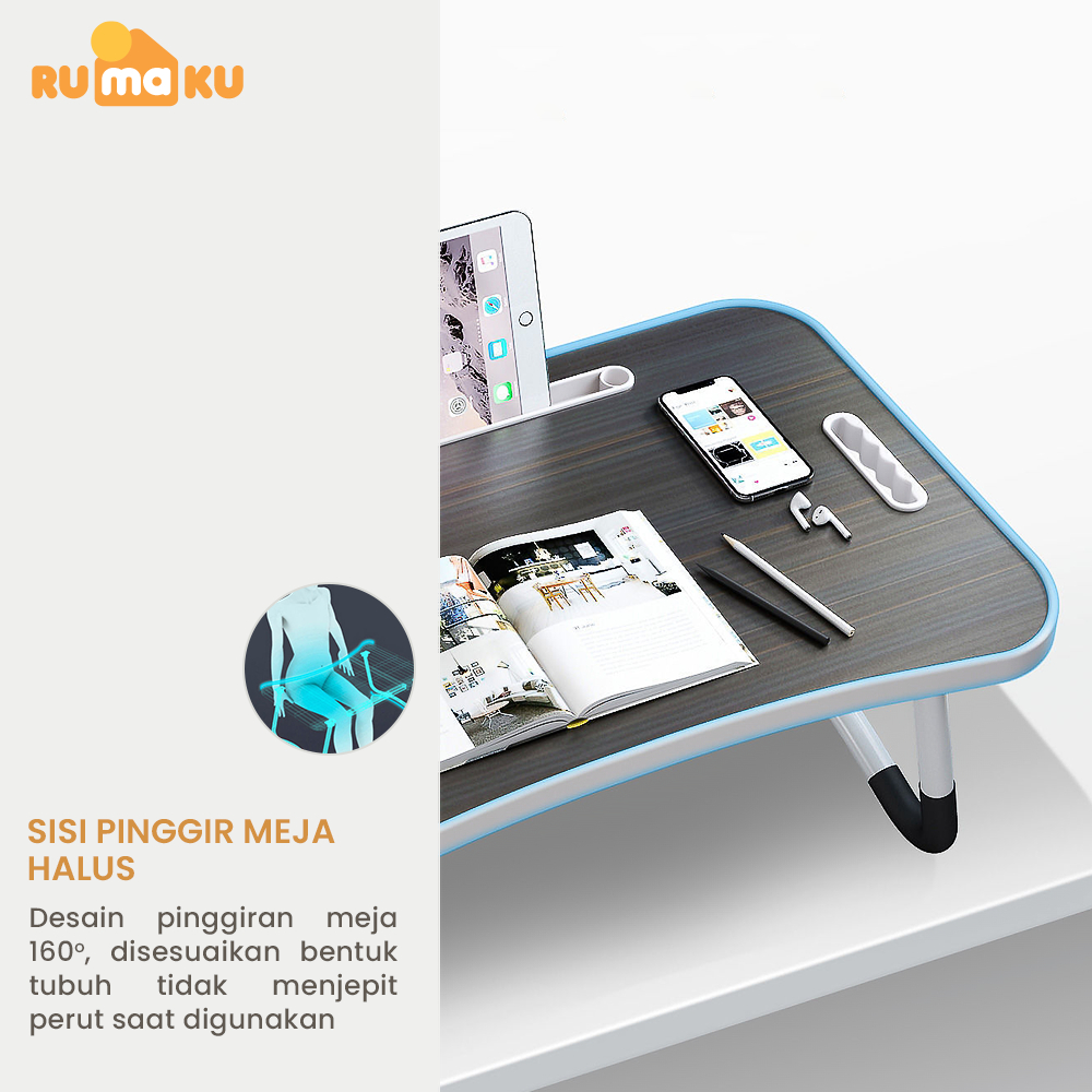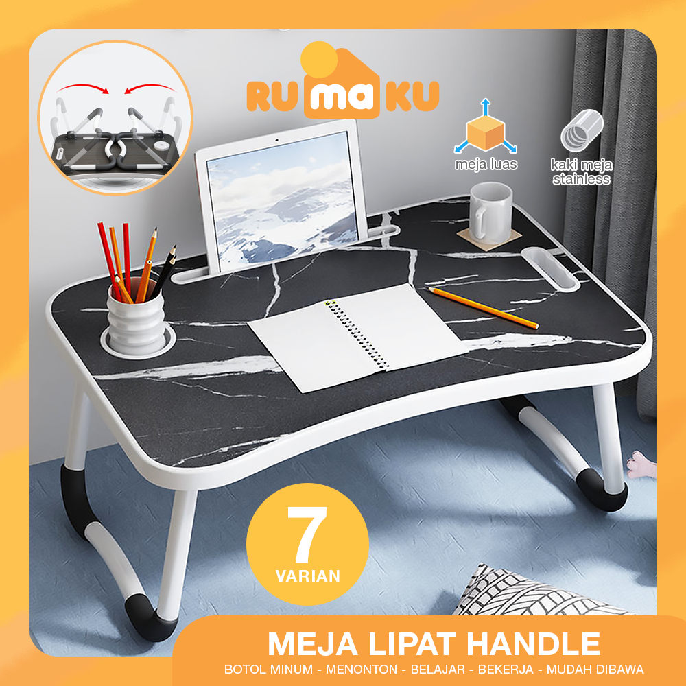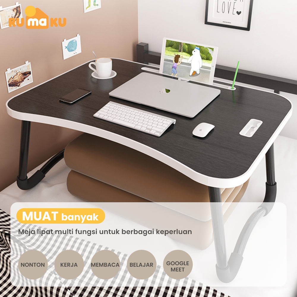 Rumaku Meja Belajar Laptop Lipat Portable Serbaguna Bahan Kayu Kaki Besi Kokoh Dengan Pegangan Pinggir Berkualitas