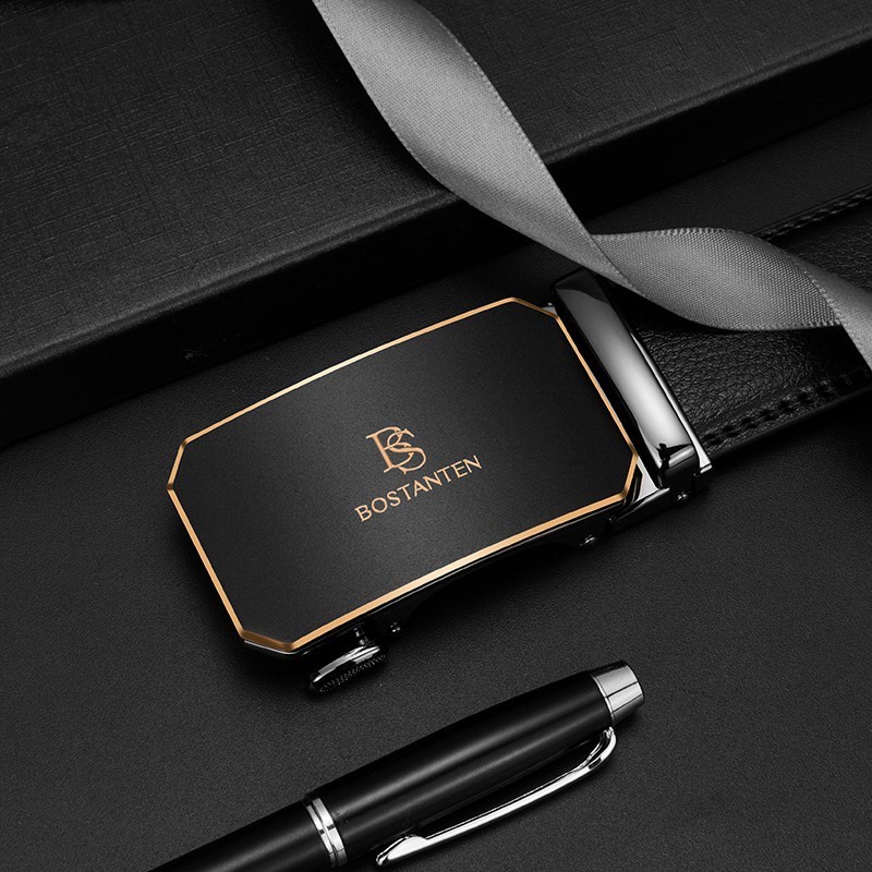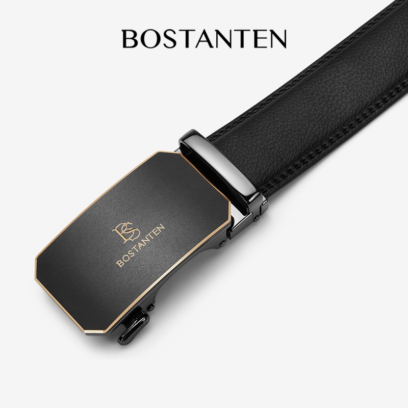 BOSTANTEN Sabuk Pria Ikat Pinggang Black Gold Gesper Otomatis Dapat Disesuaikan Kulit Sapi Asli ORIGINAL TERLARIS