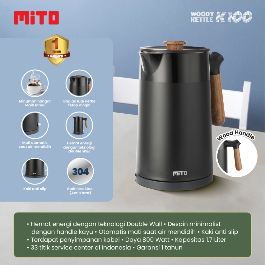 MITO Electric Kettle Woody K100 1.7L | Teko Listrik Pemanas Air Wood Handle