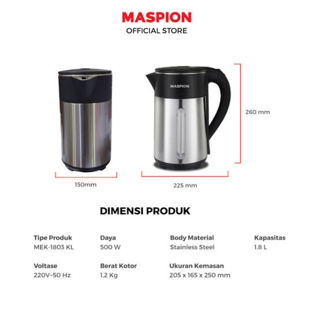 KETTLE TEKO MASPION ELEKTRIK ELECTRIC MEK 1803KL 1803 MEK1803 KL MEK1803KL KAPASITAS 1.8 1,8 LITER 1.8L 1,8L ALAT MEMASA