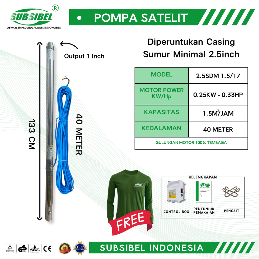POMPA SUBMERSIBLE 2.5SDM 1.5/17 - 0.33HP + KABEL 40 METER - Merek Subsibel