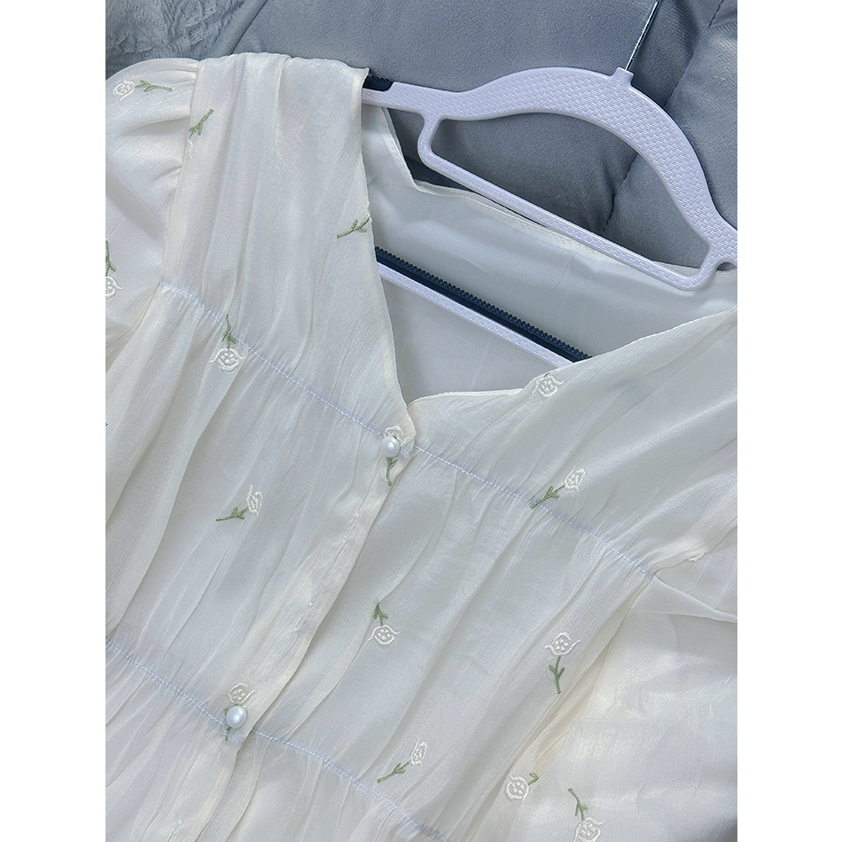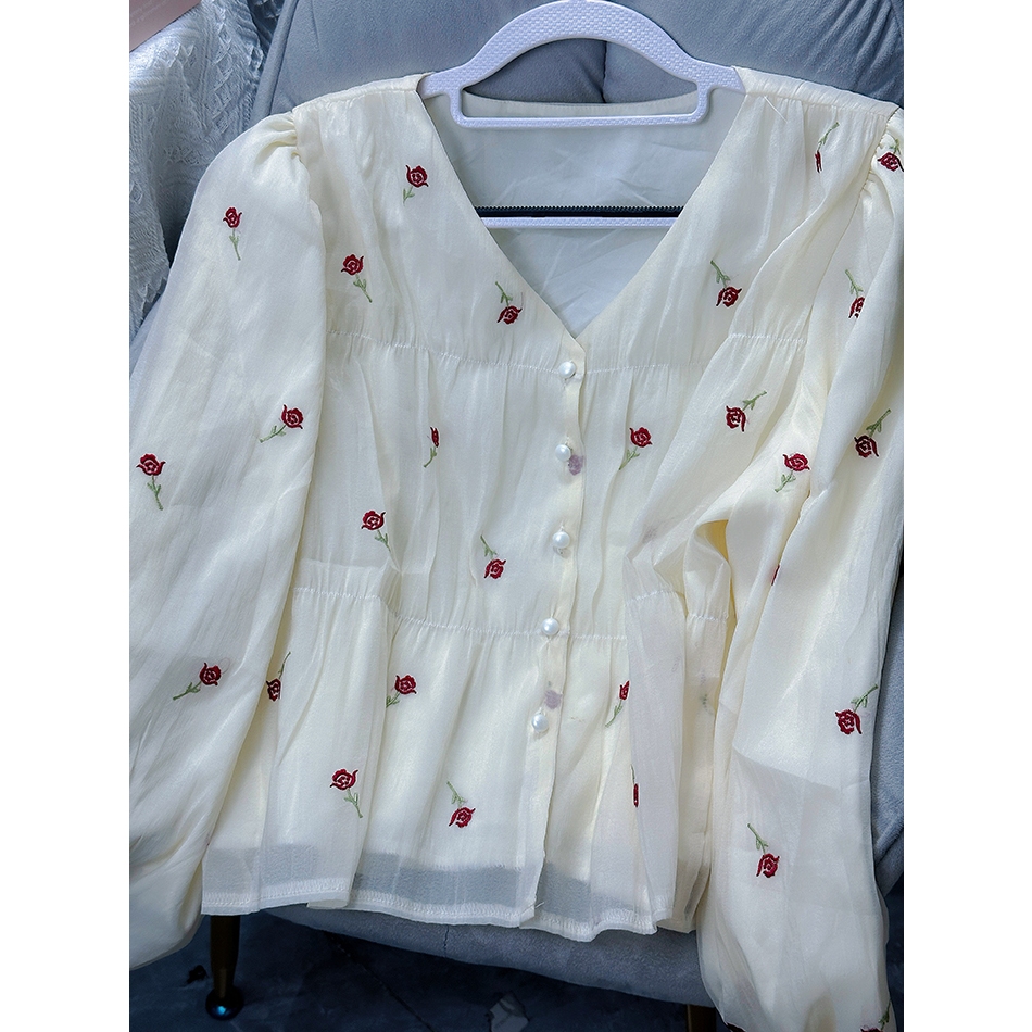 Blus Sifon Lengan Panjang Gaya Retro Baju Istana Bordir Pinggang Lentera Lengan Kemeja