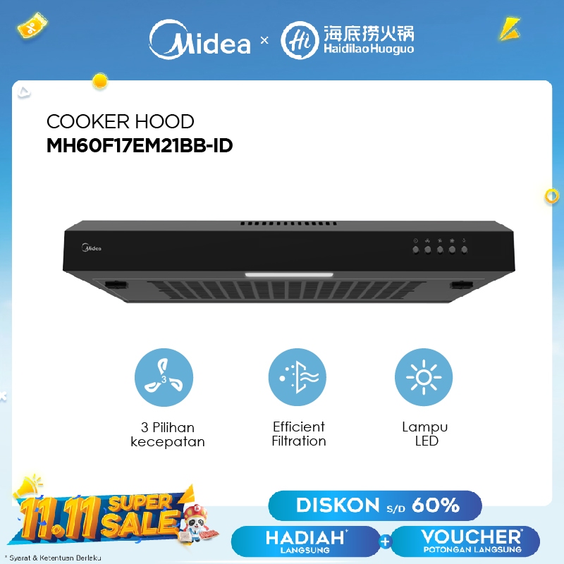 [TERLARIS] Midea Cooker Hood Slim 60cm Hitam & Stainless - MH60F17EM21BB-ID / MH60F17EM21SB-ID | Filter Aluminium, 3 Kec