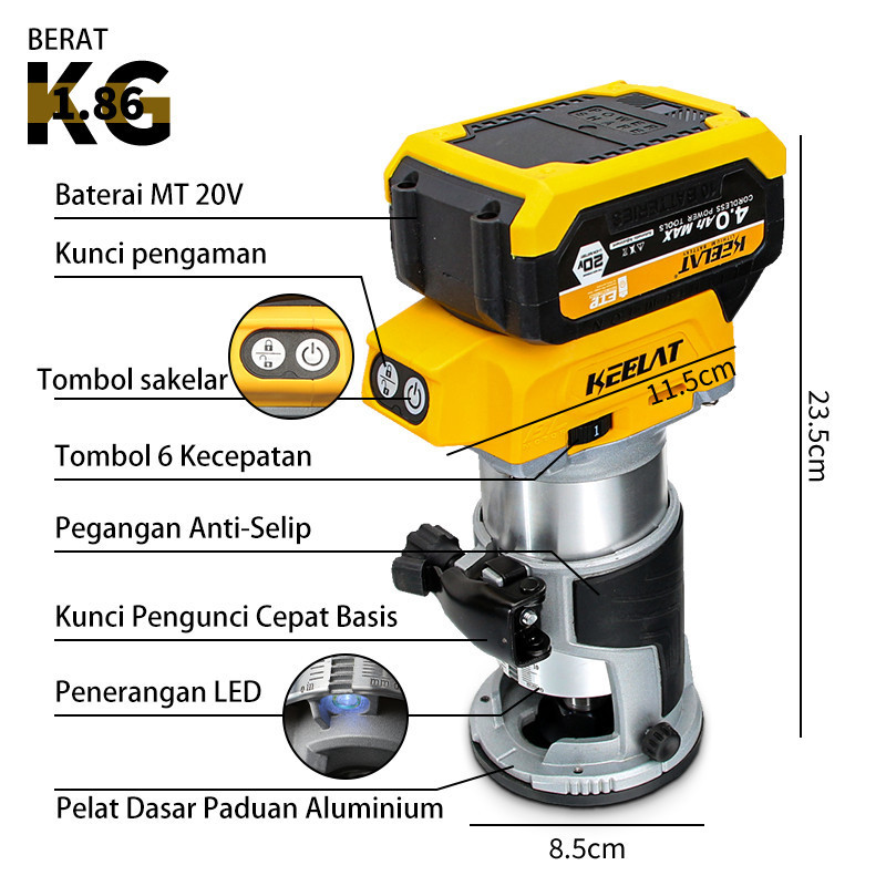 KEELAT-KCBT01 BRUSHLESS MESIN PROFIL ROUTER LAMINATE TRIMMER PEMBENTUK KAYU WOOD 20V LISTRIK 1200W