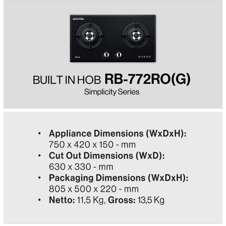 RINNAI PAKET KOMPOR GAS TANAM 2 TUNGKU RB 772RO(G) RB 772ROG RB772ROG + COOKER HOOD RH 126B / BUILT IN HOB RINNAI RB 772