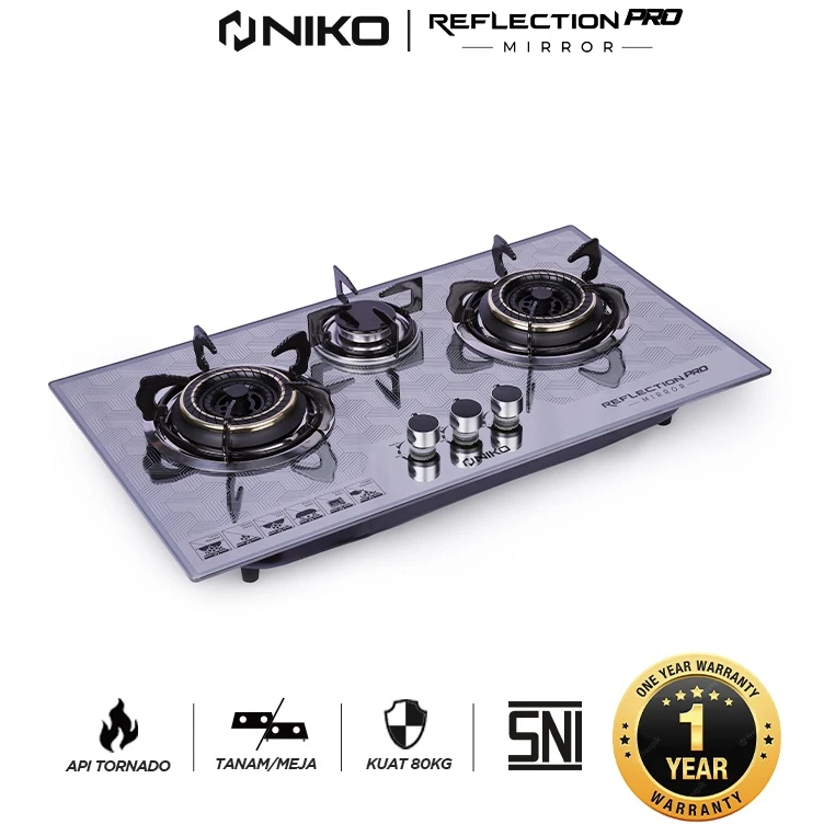 Niko Reflection Pro Mirror Kompor Gas / Kompor Tanam Kaca 3 Tungku Api Biru Tornado - FREE ONGKIR