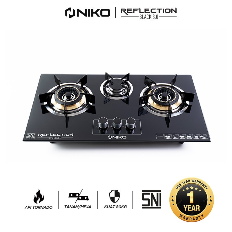Kompor Tanam Niko Reflection Black 3.0 Kaca Tempered Glass 3 Tungku Gas Stove Built In Hob Garansi Murah SNI