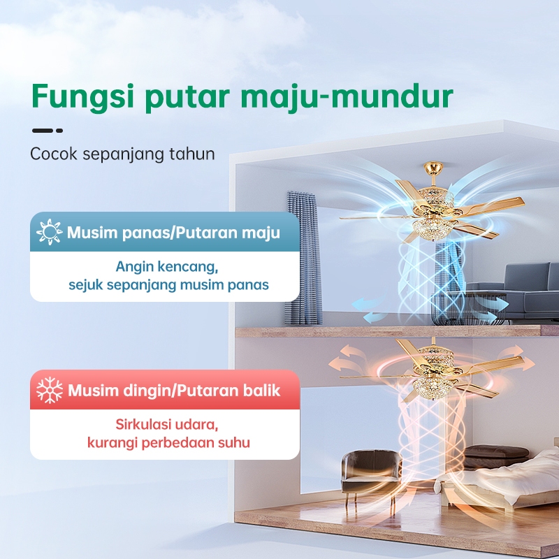Lampu Kipas Angin Plafon Kristal 3 Warna 52Inci 6Kecepatan Kipas Lampu Gantung Plafon Remote
