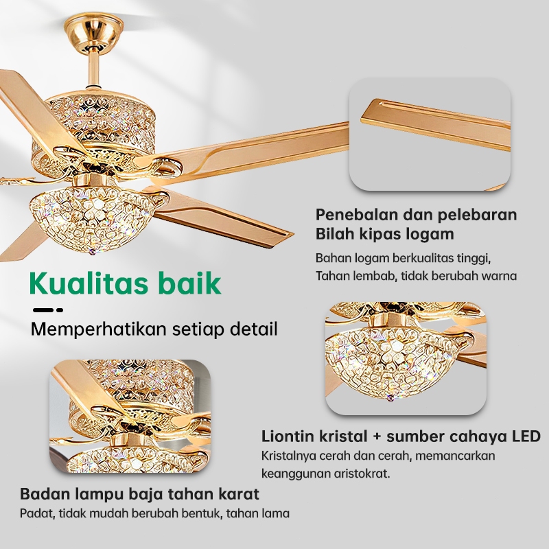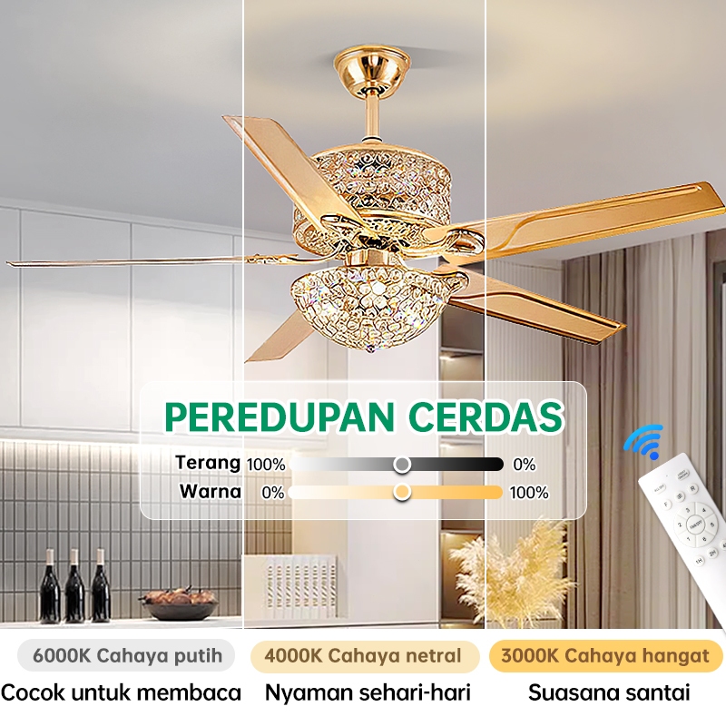 Lampu Kipas Angin Plafon Kristal 3 Warna 52Inci 6Kecepatan Kipas Lampu Gantung Plafon Remote