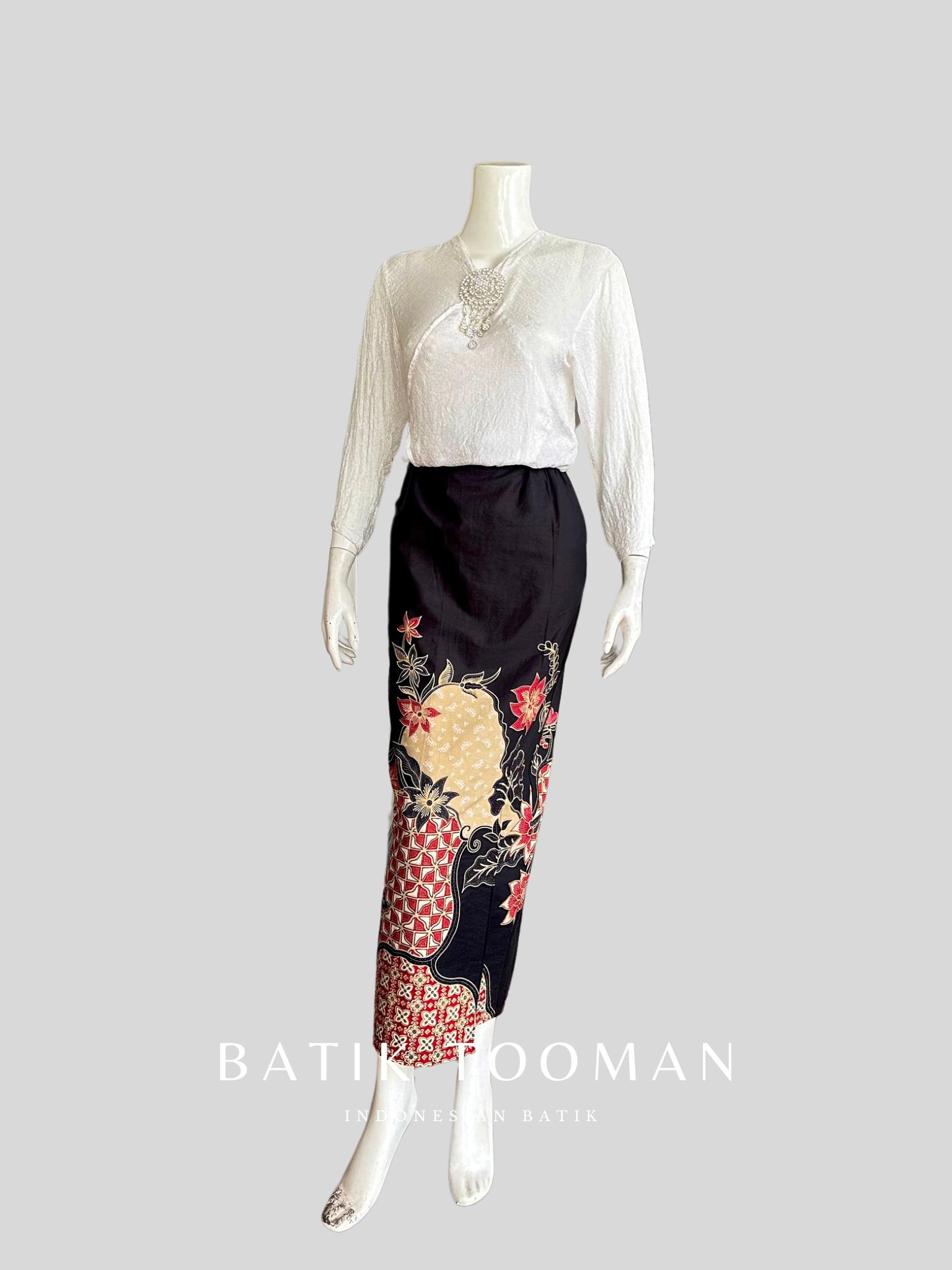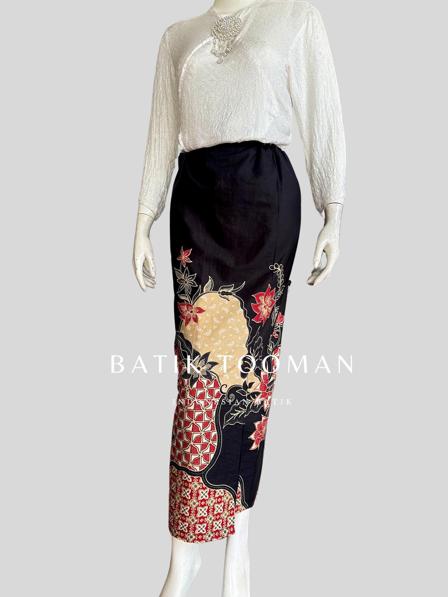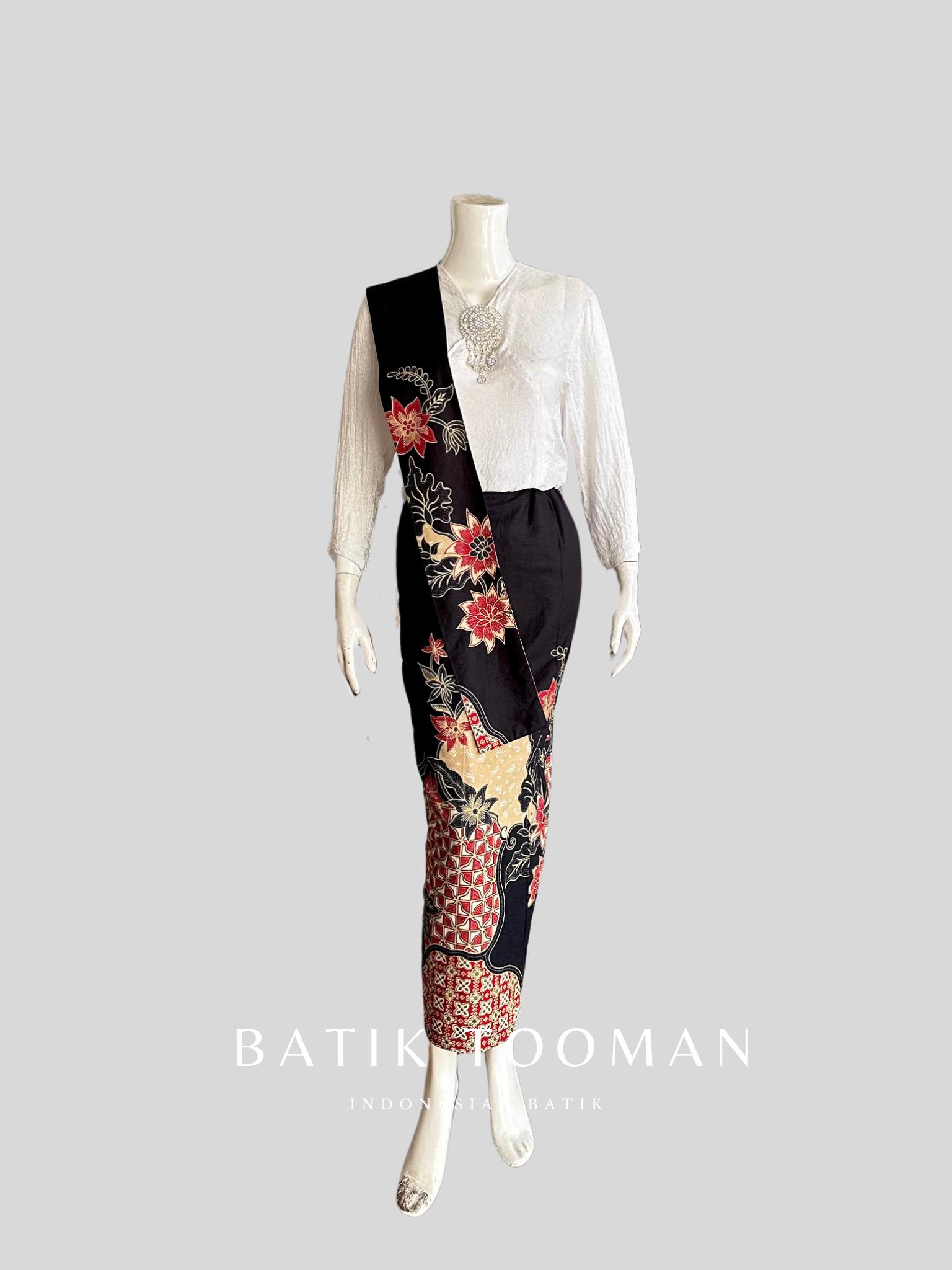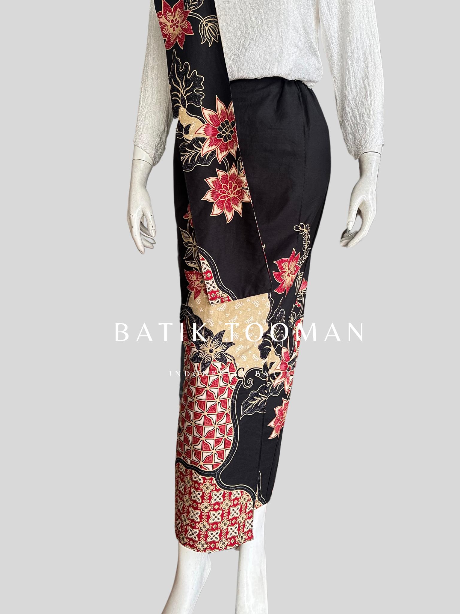 ROSARIA Black Red Rok Batik Span Instan Resleting Bahan Katun Halus Berselendang