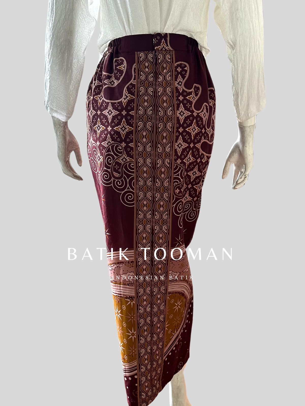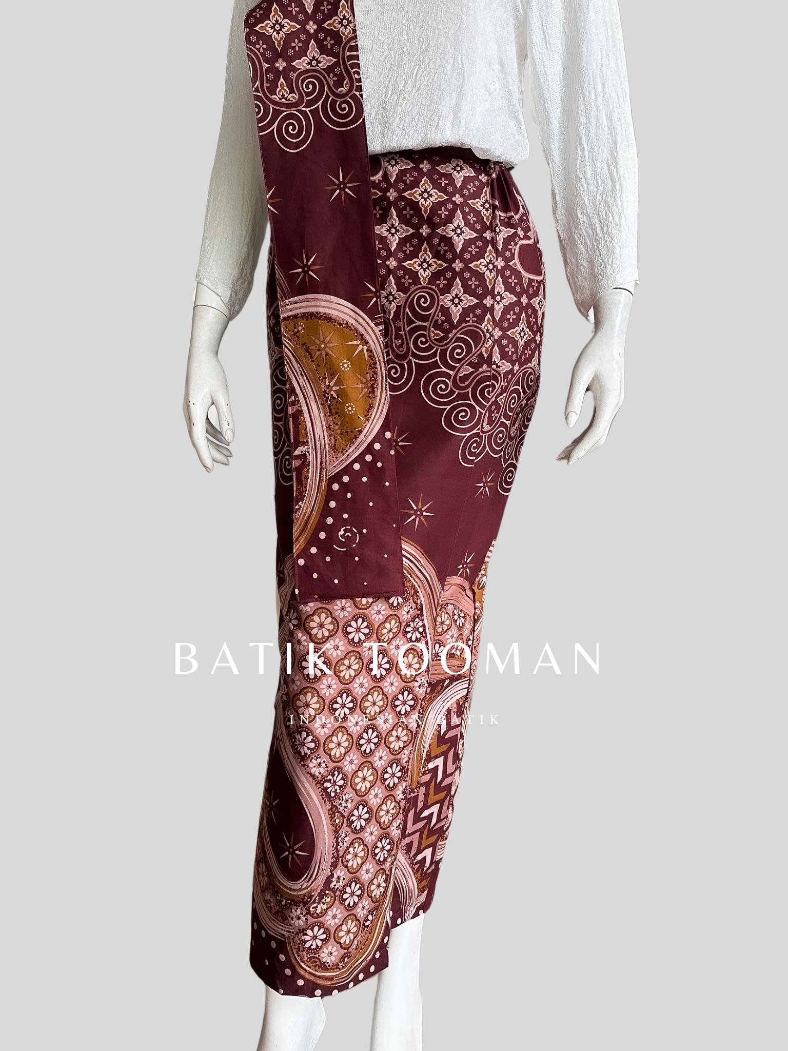APSARINI Deep Burgundy Maroon Rok Batik Span Instan Resleting Bahan Katun Halus Berselendang