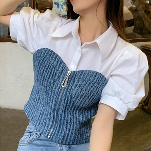 99kOUTLET Atasan Kemeja Cropped Wanita Collar Neck Lengan Puff Pendek With Tube Patchwork (S/M/L) 2219 Baju Women Short