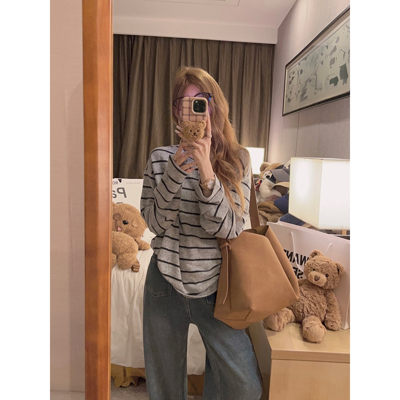 2TOYOUNG Kaos Wanita Lengan Panjang Bergaris Korea - Abu-abu Muda