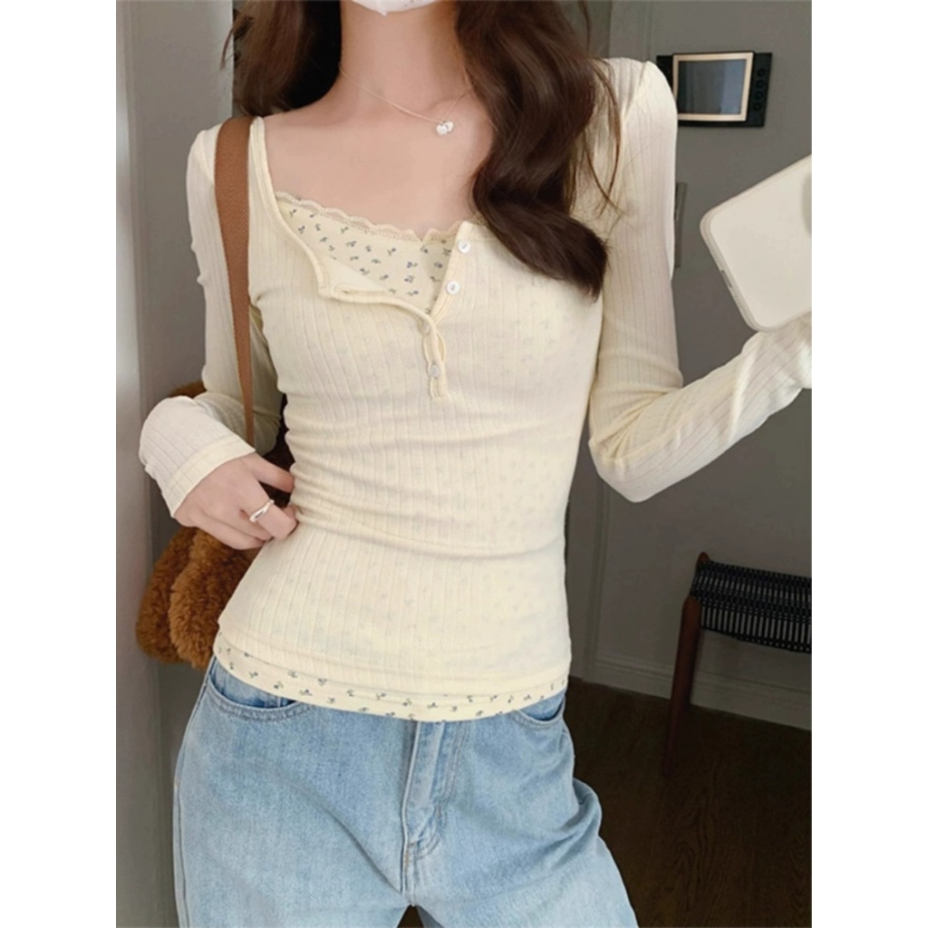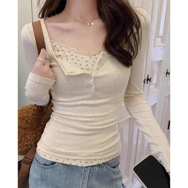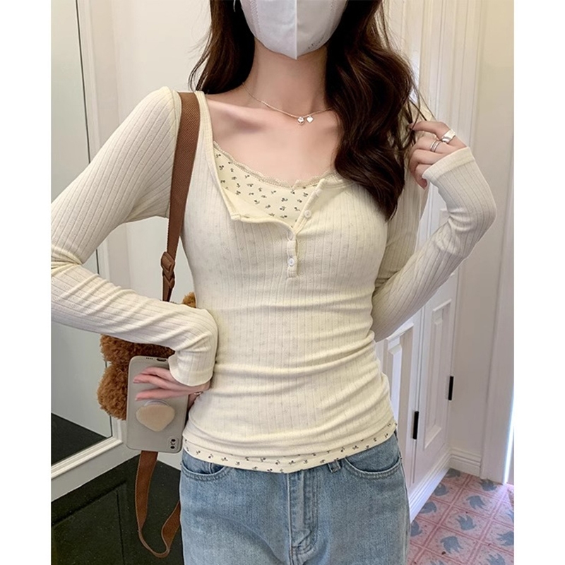 Kaus Lengan Panjang Dua Potong Palsu Sambungan Renda Atasan Slim Fit Aprikot Fashion Wanita Gaya Korea