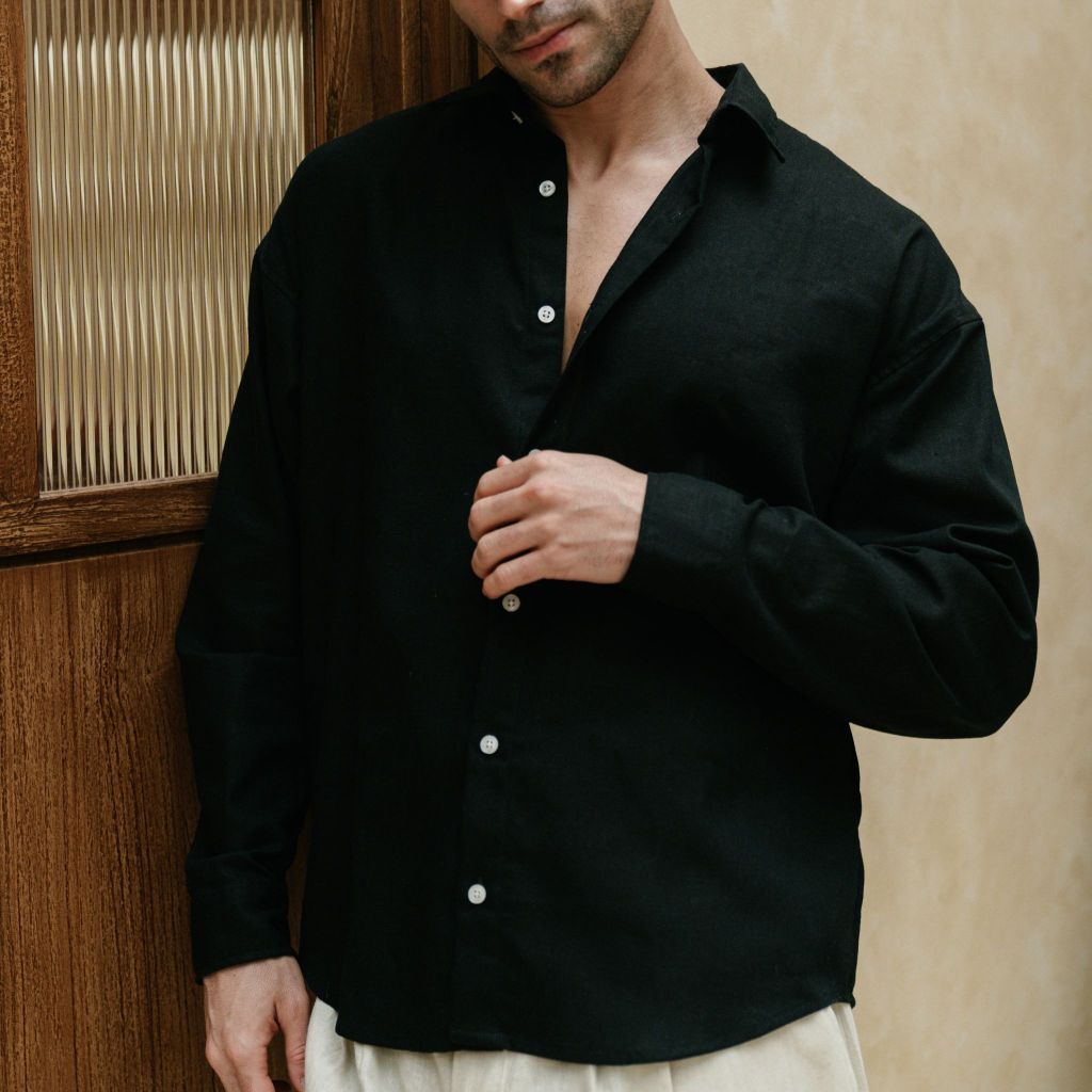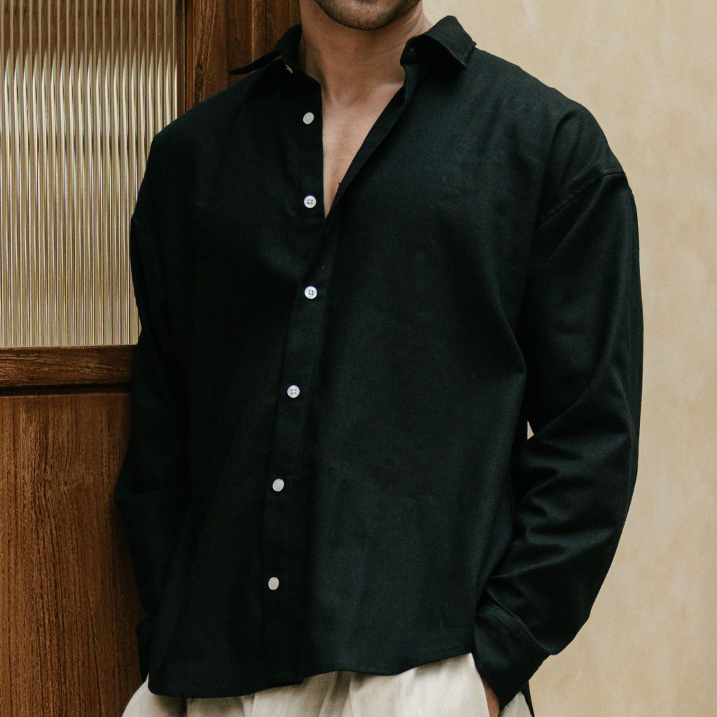 REMEDY Kemeja Linen Oversize Pria Cocok untuk Liburan Santai Casual Warna Hitam – Black Malta Linen Shirt