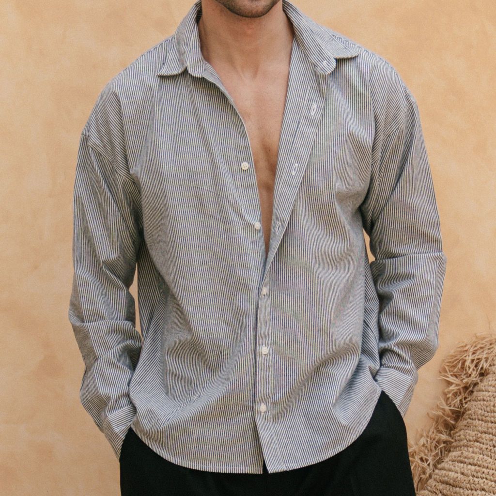 REMEDY Kemeja Linen Oversize Pria Lengan Panjang Casual Pilihan Warna Krem / Putih / Hitam / Abu Garis – Malta Linen Shi