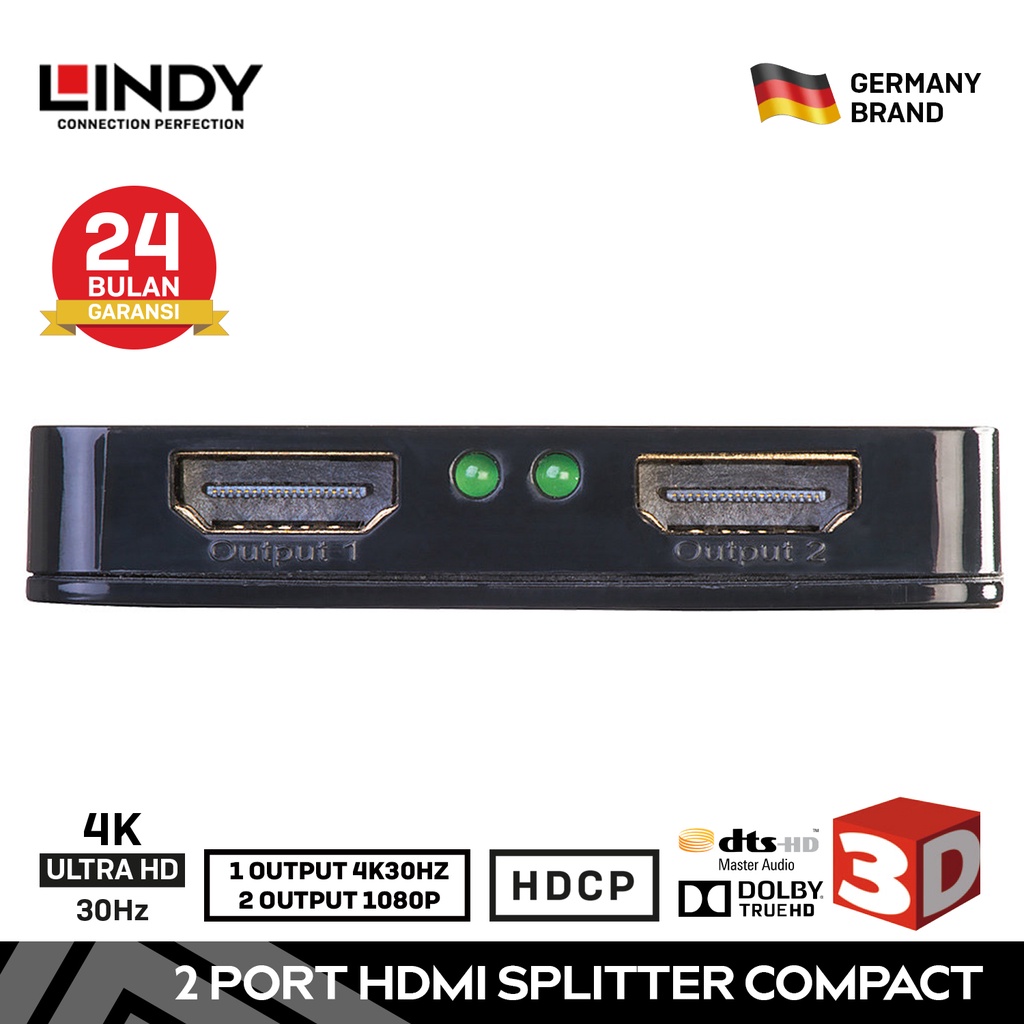 LINDY Hdmi Splitter 2 Port Splitter 1 in 2 Out Compact 2 Port Full HD 4K 1080P 3D 38157