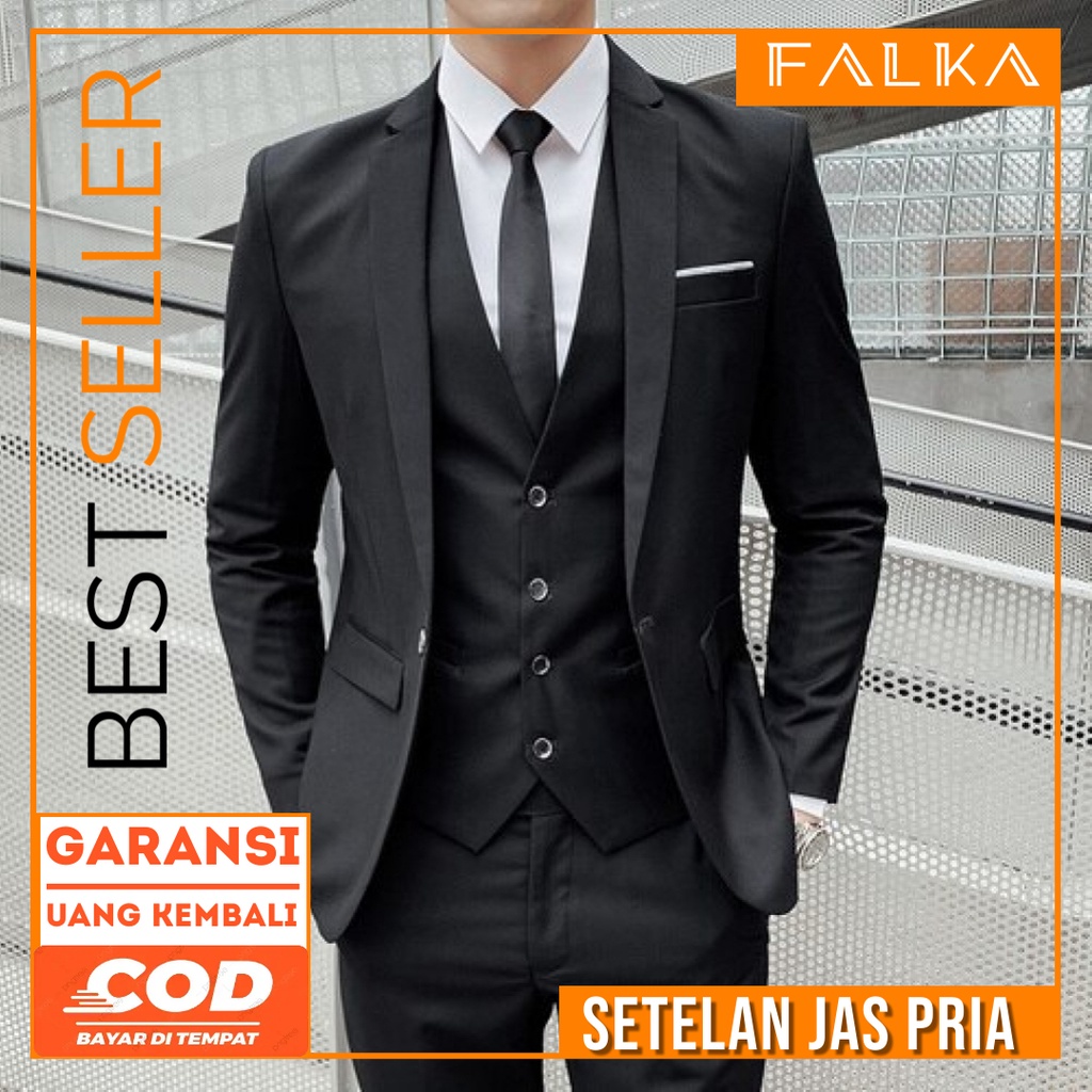 FALKA | 3 In 1 Setelan Jas Formal Pria (Jas, Rompi, dan Celana) model Slimfit bahan High Twist Tebal
