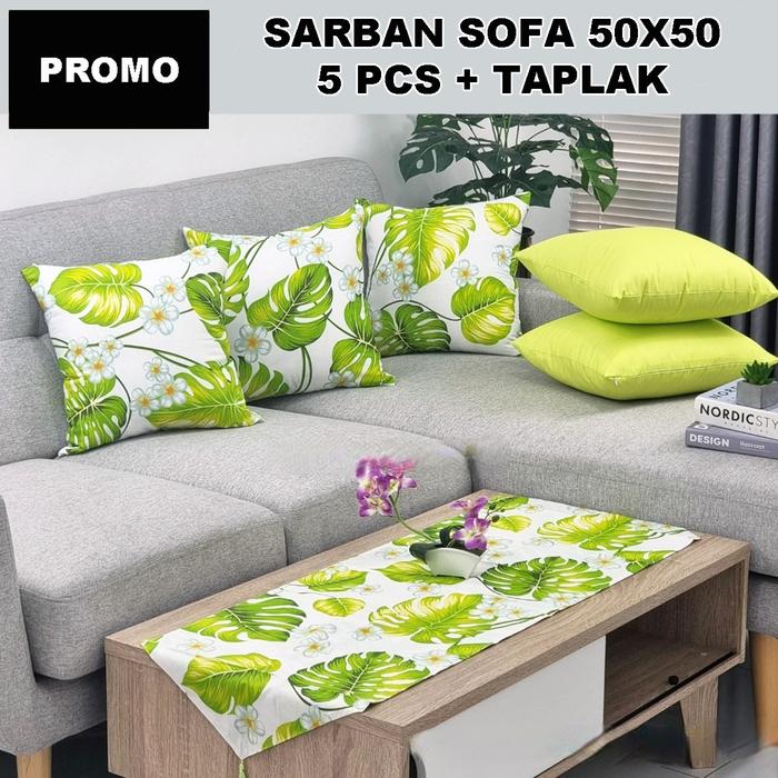() SET SARUNG BANTAL SOFA KURSI 50X50 DAN TAPLAK MEJA TAMU - GREEN MONSTERA NEW